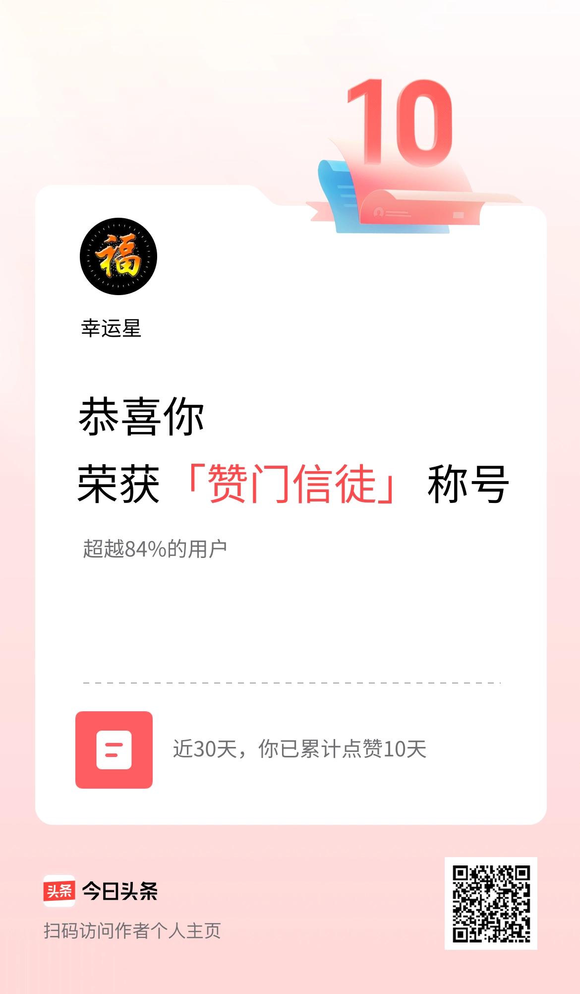 我在头条30天内点赞打卡10天,获得“赞门信徒”称号
