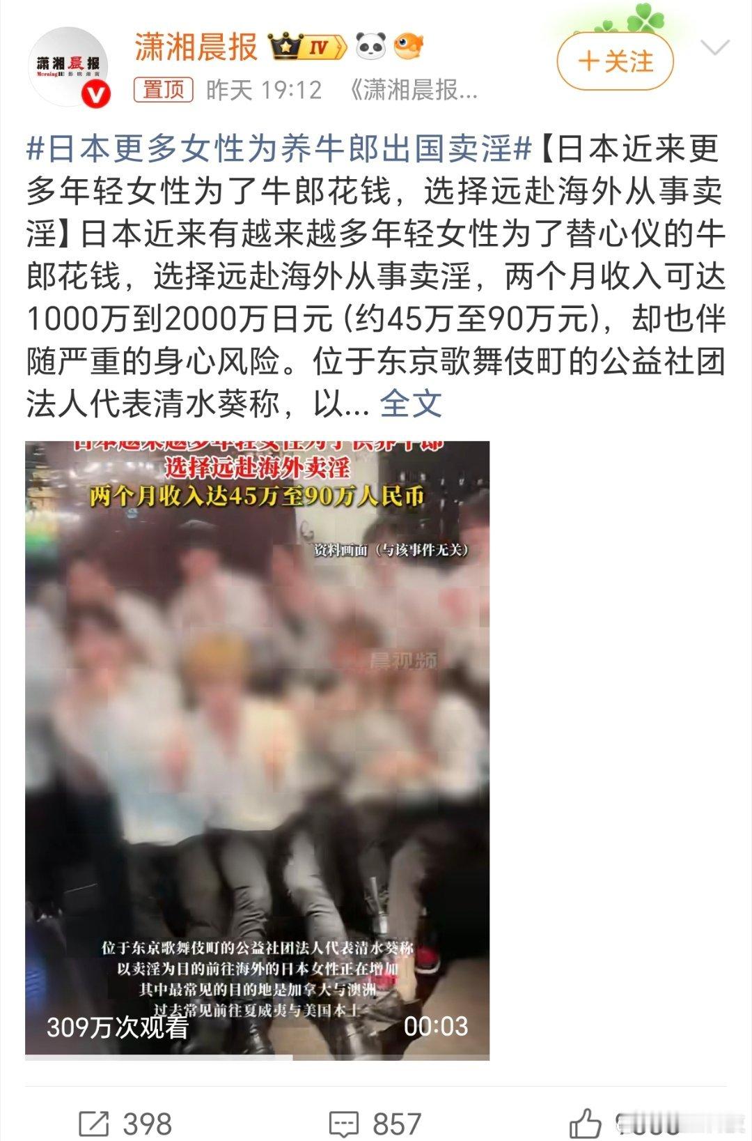 日本更多女性为养牛郎出国卖淫“牛郎”这个词是谁想的这不是在污名化“牛郎”这个人词吗?要么就说养娘炮,特么就说养夜店男模,不就好了为了这种娘炮,出去卖淫,日本女性真的心理够变态的