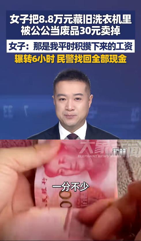 “不幸中的万幸!”福建南安,一老人在家打扫卫生时,将用不到的破旧洗衣机,以30元的价格卖掉,儿媳发工资后找不到洗衣机非常焦急,因为里面放着她积攒的88000元现金!报警后经过搜寻,终于找到了洗衣机。网友:为什么不存银行? 据大象新闻11月26日报道,事情还得从二十多天前说起,10月29日那天,家住南安的鲜女士的公公一个人在家闲着没事,寻思着把家里收拾收拾。 老人看着屋子角落里那台又旧又破的洗衣机,觉得特别碍眼,放着占地方,用也用不上,机身上都落了一层厚厚的灰。 正巧这时,屋外传来了收废品小贩骑着三轮车的吆喝声,老人心里一合计,这破玩意儿留着也是浪费,不如卖了换几个零花钱,还能把地方腾出来,一举两得。 于是,他把小贩叫了进来,三言两语就把价钱谈好了,就这样,一台藏着一个家庭多年积蓄的洗衣机,被当成一堆废铁,以30元的价格送上了废品回收车。 老人压根不知道,这台洗衣机是儿媳鲜女士的“私人保险柜”,里面藏着她辛辛苦苦攒下的血汗钱。 时间一晃就到了11月20日,鲜女士这天发了工资,跟往常一样,她打算把新到手的钱也存进自己的“小金库”。 可她回到家,习惯性地往角落里一看,心当场就凉了半截——洗衣机不见了!她急忙跑去问公公,老人这才恍然大悟般地说:“哦,那个破洗衣机啊,太占地方了,二十多天前我就当废品给卖了,卖了30块钱呢!” 听到这话,鲜女士眼前一黑,差点没站稳,那里面可有她存的八万八千块钱呢,这是鲜女士省吃俭用,一张一张攒下来的钱,是她几年来的心血。 现在,这些心血就这么不明不白地以30块钱的价格“卖”了出去,这谁受得了? 一家人不敢耽搁,立刻报了警。 民警接到报警后,迅速展开调查,可最大的难题是,事情已经过去了二十多天,收废品这个行当,东西流转得特别快,一台旧洗衣机,通常几天之内就会被送到处理厂拆解。 二十多天的时间,那台洗衣机恐怕早就变成一堆零件,甚至已经被熔化成了铁水,民警心里也清楚,找回来的希望非常渺茫,但看着鲜女士一家人焦急无助的样子,他们决定无论如何都要试一试。 通过细致的排查和走访,民警在当天傍晚就找到了那个上门收废品的小贩陈某,可陈某带来的消息,却让大家的心又沉了下去。 他说,那台洗衣机他早就转手送到了一个大型的旧家电回收处理厂,跟成千上万台废旧电器堆在了一起。 情况紧急,民警立刻带着陈某和鲜女士一家人,火急火燎地赶往那个回收厂,到了地方,所有人都被眼前的景象惊呆了——废旧电器堆积如山,各种型号的洗衣机、冰箱、电视机混杂在一起,一眼望不到头。 想在这片“电器坟场”里找到那台特定的洗衣机,无异于大海捞针,天色渐渐暗了下来,大家的心也越来越沉。 但民警没有放弃,他们打开手电筒,根据鲜女士对洗衣机品牌、颜色和一些细节特征的描述,在一堆还没来得及拆解的旧家电里,一台一台地仔细辨认、翻找。 时间一分一秒地过去,翻了几十台洗衣机,依然一无所获,鲜女士的心里五味杂陈,既盼着奇迹出现,又害怕最终一无所有。 就在大家快要绝望的时候,鲜女士突然指着一台积满灰尘的洗衣机喊道:“就是这台!我记得侧面有个小划痕!” 民警们精神一振,赶紧上前,为了不损坏里面的东西,他们小心翼翼地拆开洗衣机的后盖板。在夹层里,一个被包裹得严严实实的铁饼干盒赫然出现在众人眼前。 打开盒子,一沓沓捆扎整齐的现金完好无损地躺在里面,经过现场清点,88000元,一分不少!看到钱失而复得的那一刻,鲜女士紧绷了半天的神经终于松弛下来,激动得眼泪直流,嘴里不停地对民警说着“谢谢”。 这趟过山车一样的心情起伏,终于在找到钱的那一刻画上了句号,这件事在网上传开后,引起了很多人的讨论。 有网友评论说:“还好是找回来了,这要真丢了,一家人得闹成什么样啊?” 还有很多人表示不解:“现在都什么年代了,为什么还有人把这么多现金放在家里?存银行不香吗?安全还有利息拿。” 这些评论说得很有道理,很多人,尤其是老一辈,总觉得钱放在银行里只是一串数字,不如拿在手里、藏在家里来得踏实。 他们习惯了这种“看得见摸得着”的安全感,却忽略了这种方式背后隐藏的巨大风险,像鲜女士遇到的这种情况,如果不是运气好,洗衣机还没被拆解,这笔钱就真的打了水漂。 除了可能被家人无意中处理掉,把大量现金放在家里,还可能面临被盗、发霉、虫蛀甚至火灾等各种意外。 所以说,这件事虽然结局是好的,但它给我们每个人都敲响了警钟,我们能够理解老一辈人的观念,但时代在变,保障财产安全的方式也需要与时俱进。 把钱存进正规的银行,不仅有国家信用作为保障,几乎不存在丢失的风险,每年还能获得一笔利息,这远比把钱藏在床底下、衣柜里,或者像鲜女士一样藏在旧家电里要安全得多。 信源:大象新闻2025-11-26