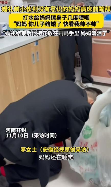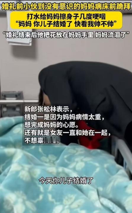 河南,一个小县城的婚礼火了——不是因为排场大,也不是因为新娘美,而是因为新郎的一个“反常”举动,让无数网友红了眼眶!新郎官结婚一大早,没有急着去迎接新娘,反而先开车去了医院!对着病床上昏迷多年的妈妈,哽咽说道:“妈,我今天结婚啦,你不是一直盼着我结婚吗。你看看我,穿着西装帅不帅?” 事情的起因是在张明(化名)与相恋多年的女友结婚的当天,他早早的就起床准备好了一切,然而令我们意想不到的是,他没有第一时间去接新娘,而是开车跑去了医院。 到医院之后,病房里的灯光总是昏昏黄黄的,张明推开门时,他的母亲躺在病床上,面色苍白,鼻饲管从嘴角延伸出来,多年前那场病让她陷入昏迷,从此再没醒过来。 这些年,家里人轮流照护,张明只要得空就往医院跑,母亲的手他不知握了多少次。 这天他穿着新西装,领带系得一丝不苟,走到病床边时,声音忍不住哽咽,却还是尽量放得平缓,妈,你儿子今天结婚了。 他伸手轻轻抚摸母亲的脸颊,又把自己的西装外套脱下来,小心地披在母亲肩头,你不是一直盼着我成家吗? 没有华丽的词藻,就是一遍遍叫着,讲自己和新娘的相遇,像平常一样跟母亲唠嗑,仿佛母亲只是闭着眼听他说话,这样的对话持续了十多分钟,病房里的护士悄悄递过纸巾,陪在旁边的亲戚早就红了眼眶。 临走前,张明对着镜子理了理有些乱的发型,拿出手机给母亲拍了几张照片,镜头里,他笑着。 赶回婚礼现场时,新娘和双方家人已经站在门口等他,张明脸上带着难掩的疲惫,还有没擦干的泪痕,只能露出一个抱歉的笑,所有人都知道他去了哪里,没人提迟到的事,新娘更是直接握住他的手,说出了那句让全场动容的话。 婚礼就在这样含泪的祝福里开始了,有人把现场的照片和这段故事发到网上,很快就在朋友圈和短视频平台传开了。 网友的评论刷了好几页,有人说 这才是真孝顺,比任何排场都体面,懂事的儿子,善良的新娘,这家人一定会幸福,还有人提到,镜头没拍到的地方,是张明这些年日复一日的照护,是他在工作和医院之间的奔波,这份选择背后藏着多少不易,只有他自己最清楚。 现在的婚礼总讲究场面大、彩礼多,可张明的婚礼让大家明白,真正的体面从来不是这些,把最重要的人放在心里,就算对方听不见、看不到,也愿意把人生中最关键的时刻分享给她,这才是最珍贵的仪式感。 这场没有大张旗鼓炫耀的婚礼,成了很多人心里的温暖样本,它让我们看见,责任和温情从来都不是负担,带着牵挂往前走的人,脚步反而会更坚定,而那些藏在细节里的孝心,比任何誓言都更能打动人心。 对此,你还有什么看法呢?