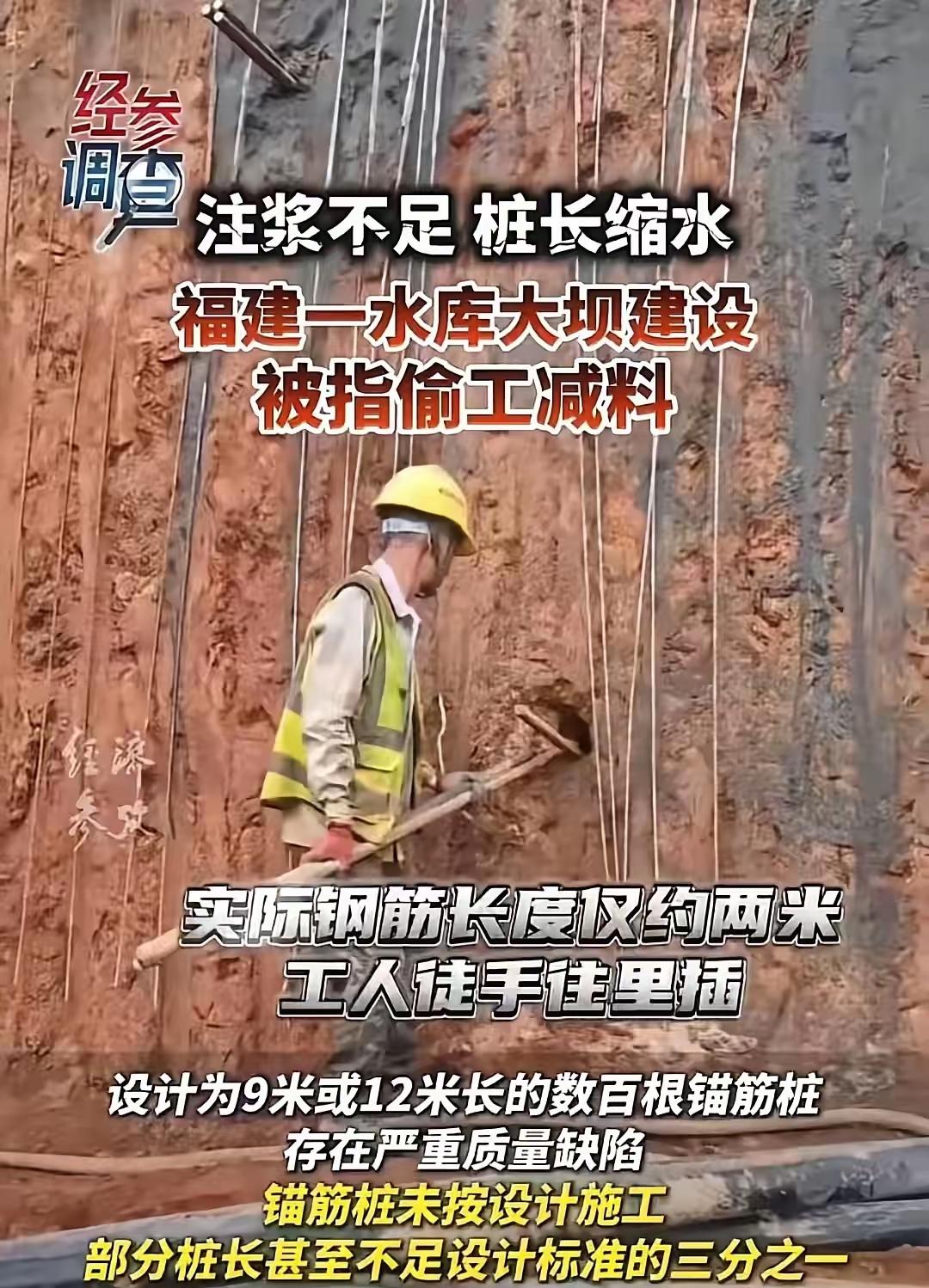 还有人把“生命重于泰山”当回事吗?国家“十四五”重点工程福建永安抽蓄电站,竟被曝出藏着致命猫腻,记者王文志的曝光简直撕开了行业遮羞布!12米的锚筋桩硬生生缩成2米,4袋水泥的用量被偷换成1袋灌十几个桩,本该固若金汤的大坝“生命线”,成了一碰就晃的摆设。 更恶心的是,监理本该是质量守门人,却忙着接受KTV有偿陪侍,把监督职责抛到九霄云外。要知道这大坝得扛住200年一遇的洪水,这些“空心桩”一旦遭遇洪峰,下游万千生命家园都将面临灭顶之灾,这哪里是施工,分明是拿人命赌利益! 别拿“设计变更”当借口,未批先改、偷工减料的背后,是良心的彻底沦丧。重点工程不是敛财工具,民生安全更容不得半点糊弄。为敢说真话的王文志点赞,更盼着相关部门严查到底,让漠视生命的人付出代价!你觉得该如何杜绝这种工程乱象?来评论区聊聊!