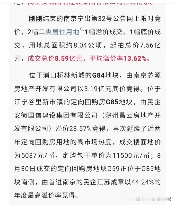 芜马滁不愧是南京的铁杆小弟,南京有需要它们是真上啊,今天南京土拍竟然又出现了一个黑马,位于江宁谷里的一块地块以23.57%的溢价率被滁州的一家企业收入囊中,这个溢价率还算不错了,毕竟南京的土拍市场已经好久都没有溢价成交了,这次给南京的土拍市场加入了一把火,虽然是定向回购房,但能溢价成交总算是好事。 如今的土拍行情已经变了,能看得见的收益地块很受追捧,比如定向回购房等。