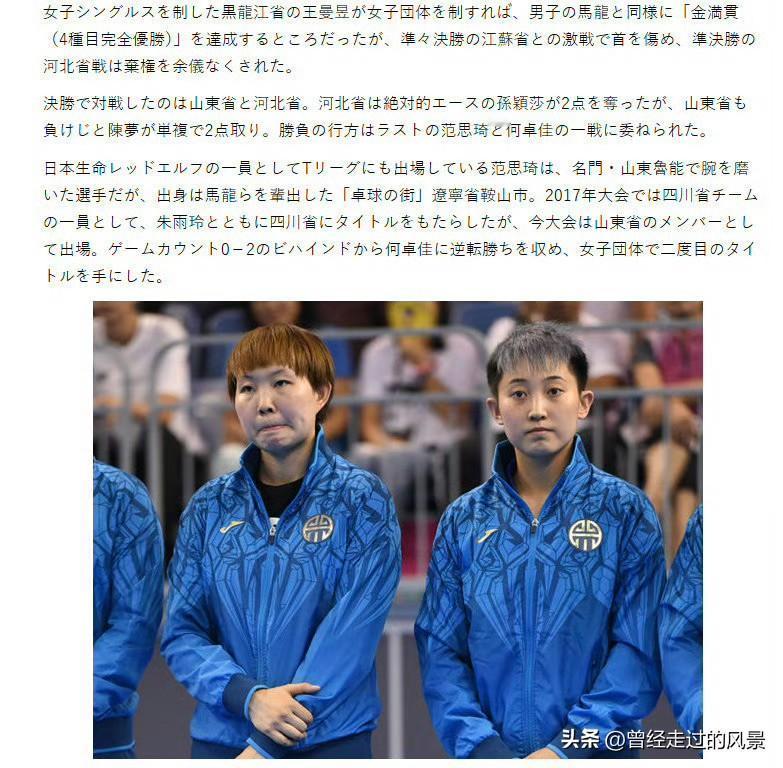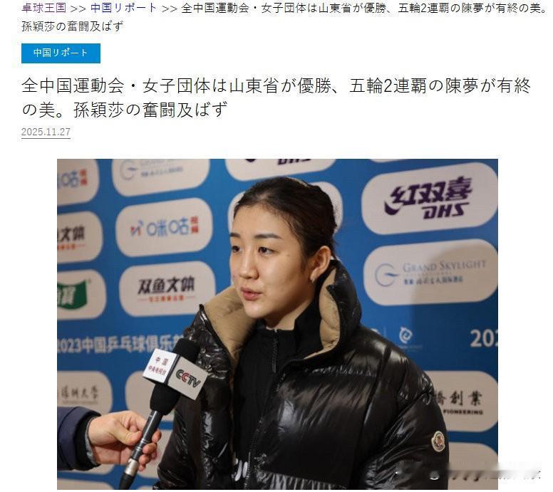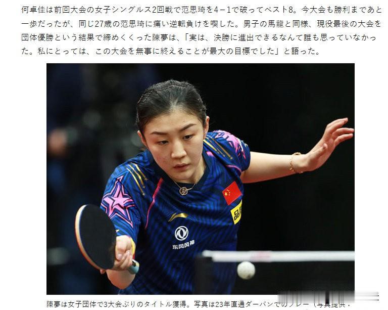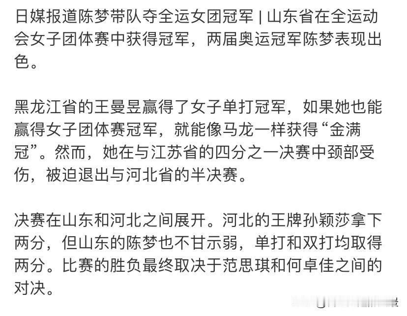 日媒报导陈梦带队夺取全运会女团冠军!奥运冠军陈梦实力还是有的,孙颖莎真的是尽力了!为什么说陈梦厉害? 因为奥运会能够卫冕冠军,实力确实有的,全运会又过关斩将,静待花开! 有网友表示,该吃吃、该喝喝,回归还能拿金牌! 挺有道理的,樊振东也是没有世界积分,但是可以赢世界积分第一! 为什么会这样呢? 说明了,虽然不打国际比赛,但是,实力还是有的,大赛经验也是存在的! 全运会决赛,孙颖莎拿到了2分,真的是尽力了,陈梦也拿到了2分,两人对决错过了! 谁能想到范思琪能逆转何卓佳? 大家有什么想法呢?