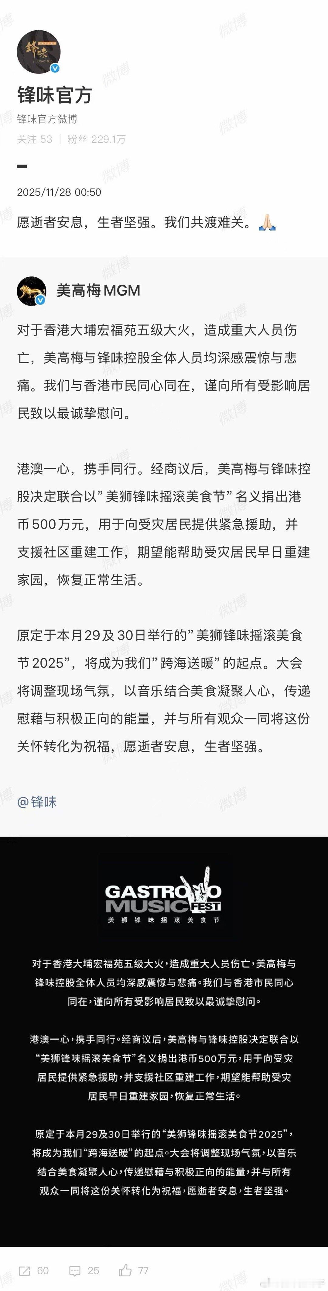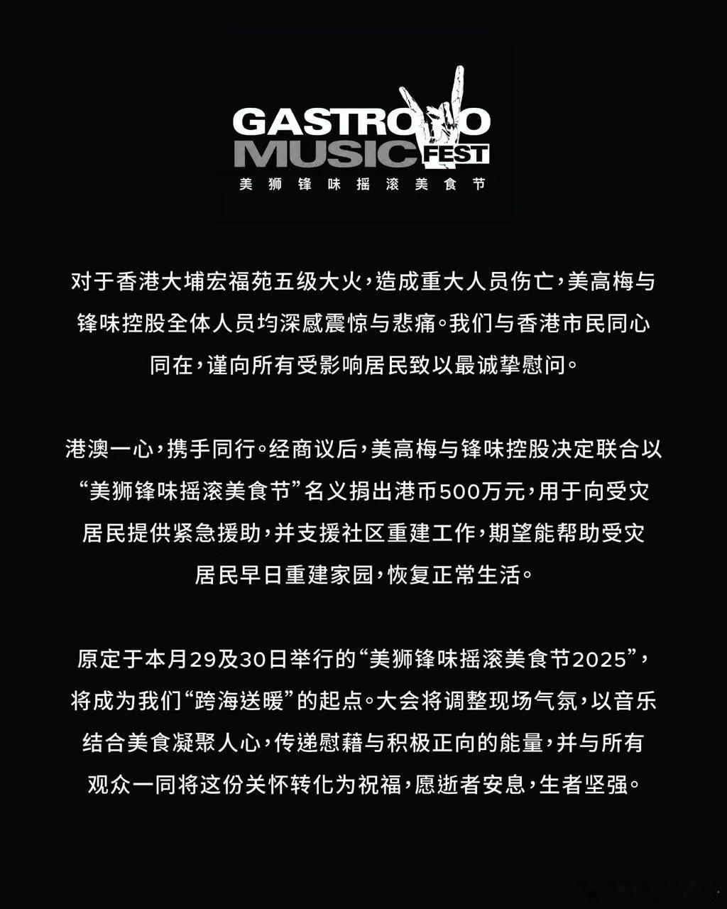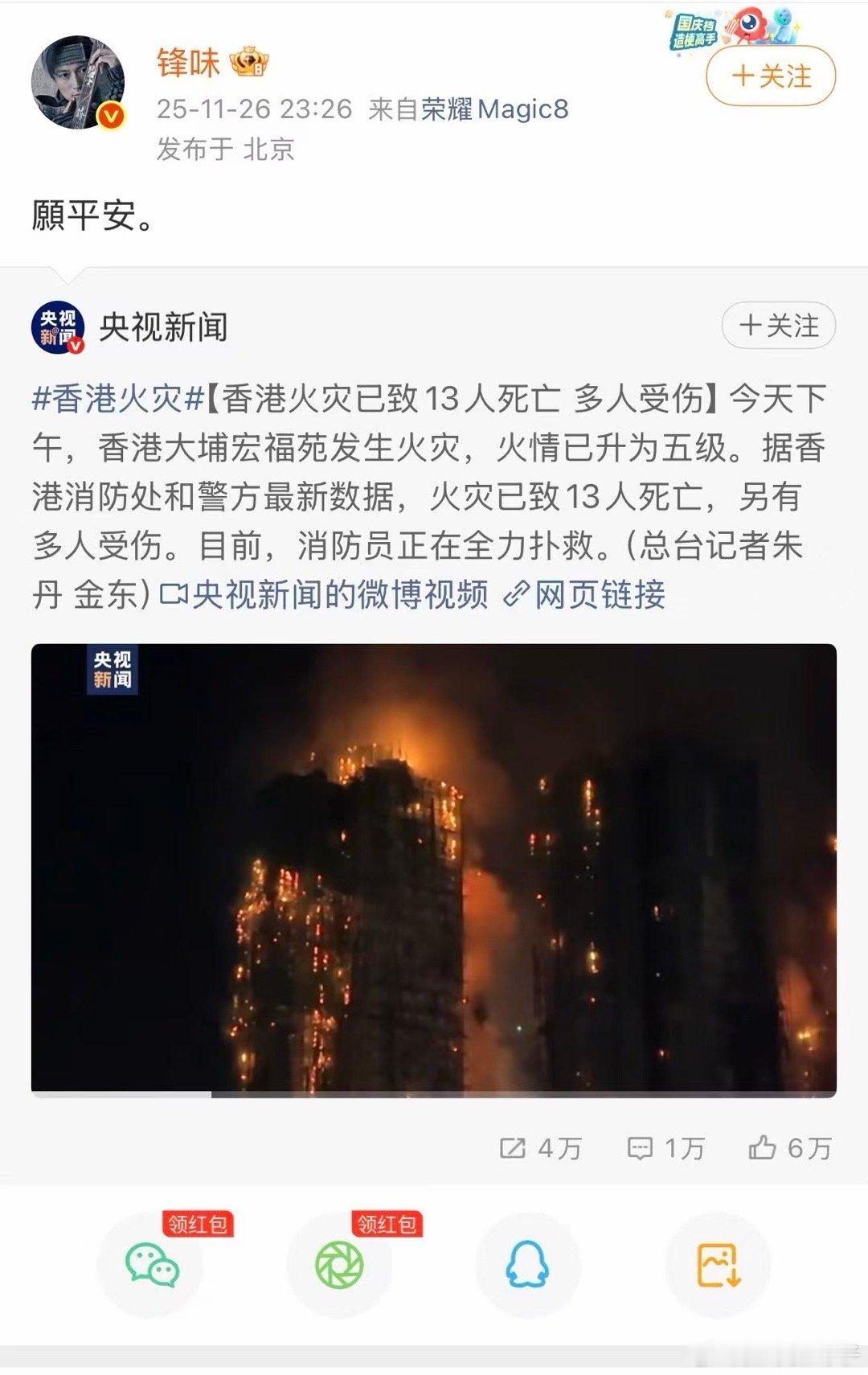 谢霆锋何超琼为香港火灾捐款500万 香港新界大埔五级火灾造成重大伤亡,谢霆锋和何超琼分别以「锋味摇滚美食节」名义捐赠500万元港币驰援灾区,善心善举,愿受灾群众早日渡过难关,重现安然家园[爱心]