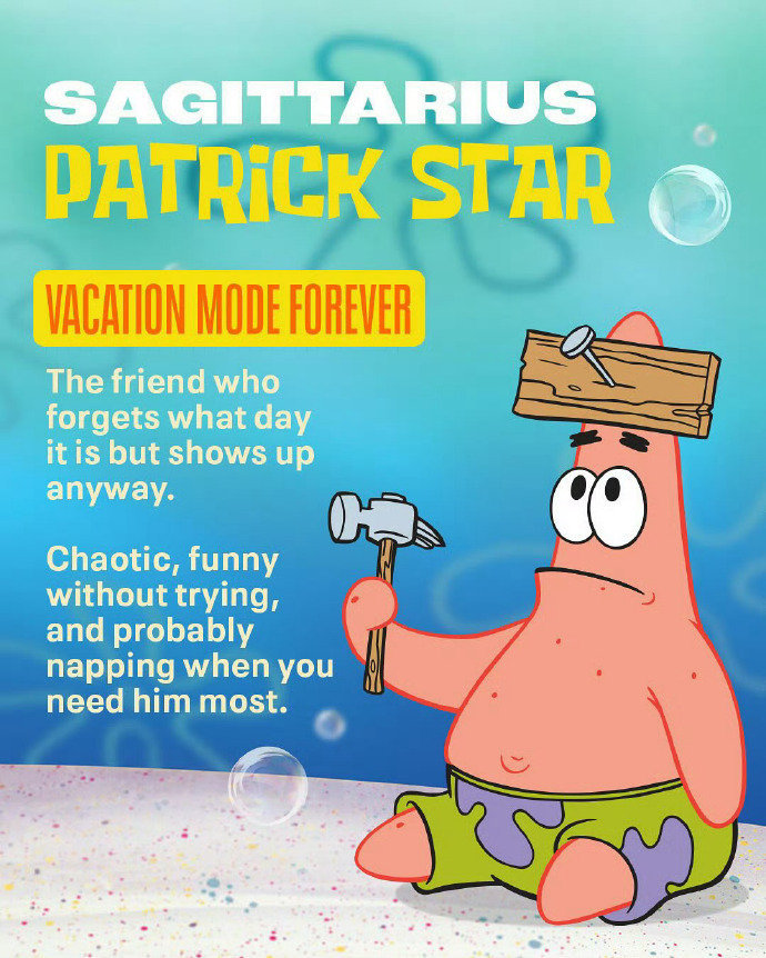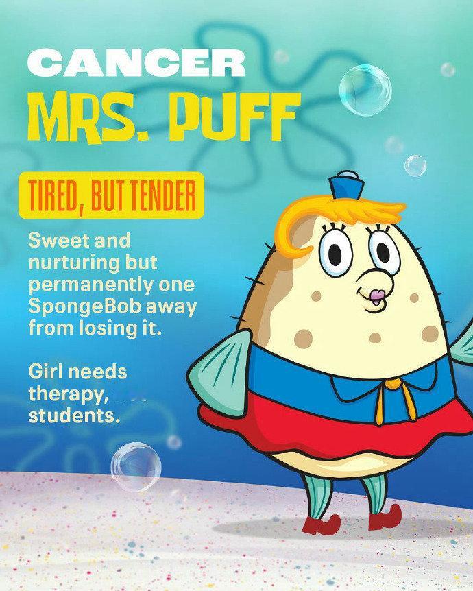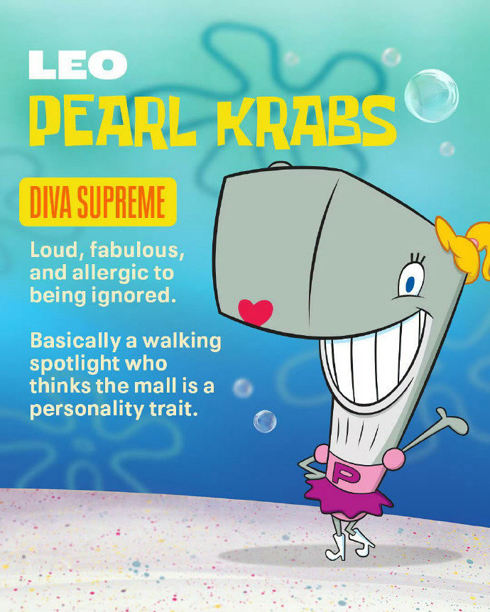 海绵宝宝角色星座也出来喽~海绵宝宝 双子座派大星 射手座章鱼哥 金牛座珊迪 白羊座蟹老板 摩羯座痞老板 天蝎座小蜗 双鱼座珍珍 狮子座泡芙老师 巨蟹座凯伦 处女座美人鱼战士 天秤座泡泡人 水瓶座
