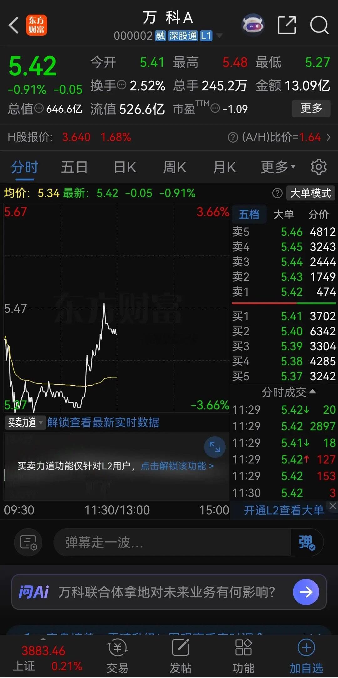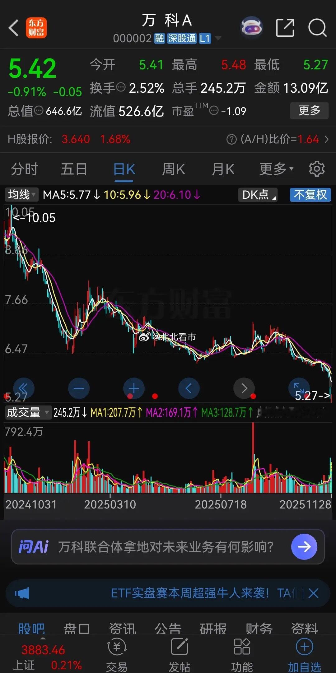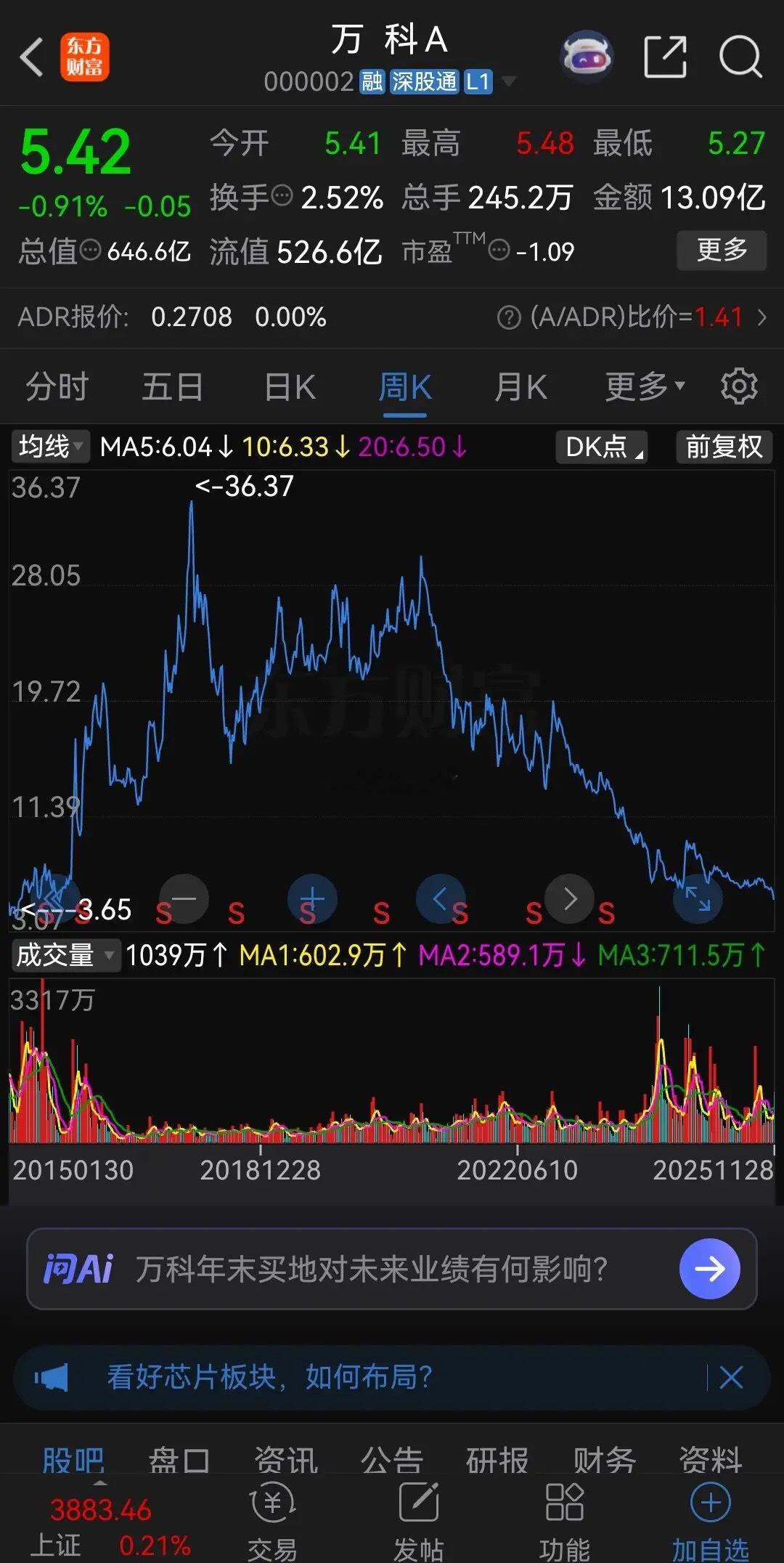 万科又跌了,投资者快崩溃了!万科昨天大跌7.13%后,今天盘中最低跌到了5.27元,跌幅一度近4%,截至上午收盘股价报收于5.42元,今天这一跌,再次创出了近十年以来的新低,走势上看完全破位,加速下跌。万科目前总市值还有646亿元,而之前辉煌的时候,公司市值近4800亿,现在跌得连个零头都不够了。前几年,地产行业进入艰难的时候,万科经营还比较好,现金流充足,每年还有几百亿的净利润,曾经鼓励众多房企,喊话要活下去,结果这才几年时间,喊话活下去的,都快活不下去了,真是做梦都没有想到啊!