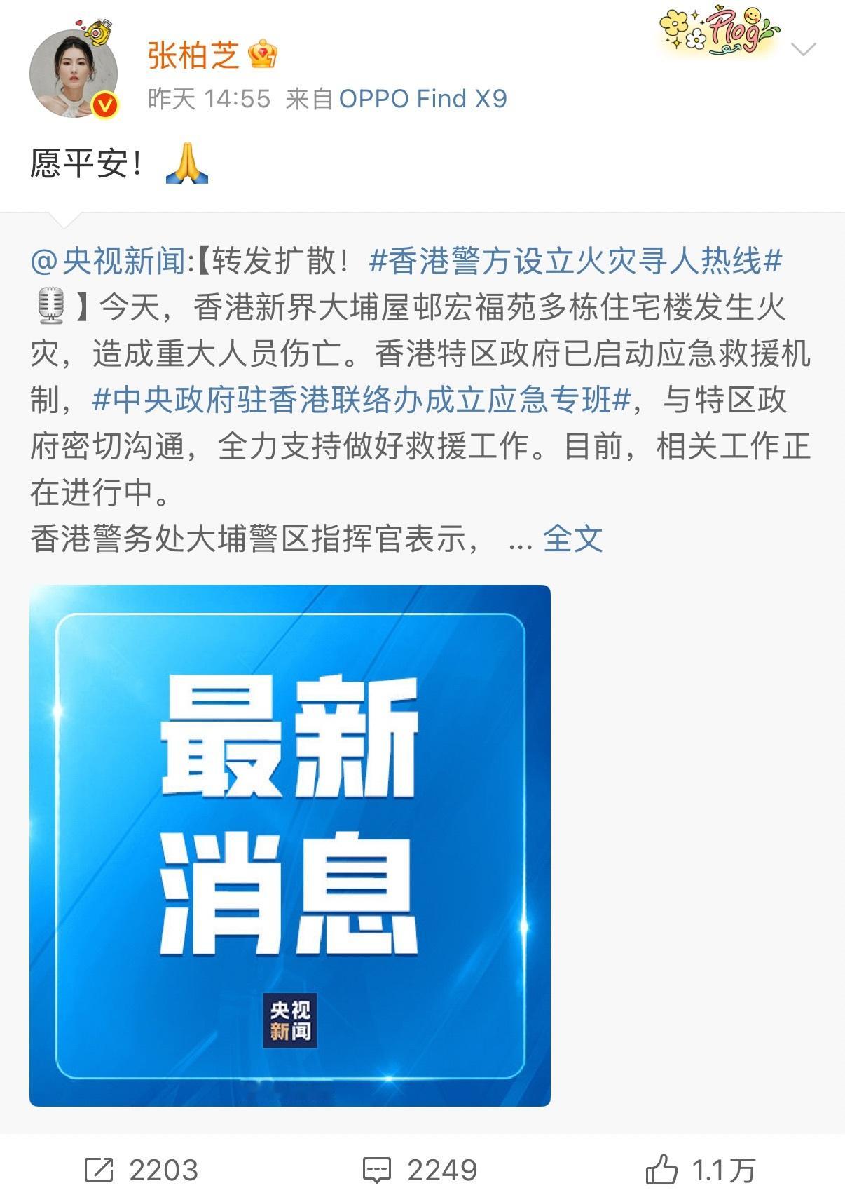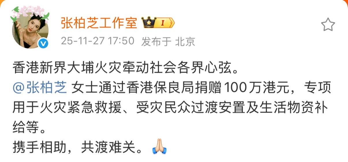 张柏芝捐款100万港币支援香港大浦火灾事故,为救助灾区贡献自己的力量!大火无情吞噬了许多无辜的生命,这样的悲剧真的让人痛心。希望柏芝的捐助能够帮助更多在灾难中受到影响的普通人,愿逝者安息,伤者早日康复,大家携手同心,共渡难关。