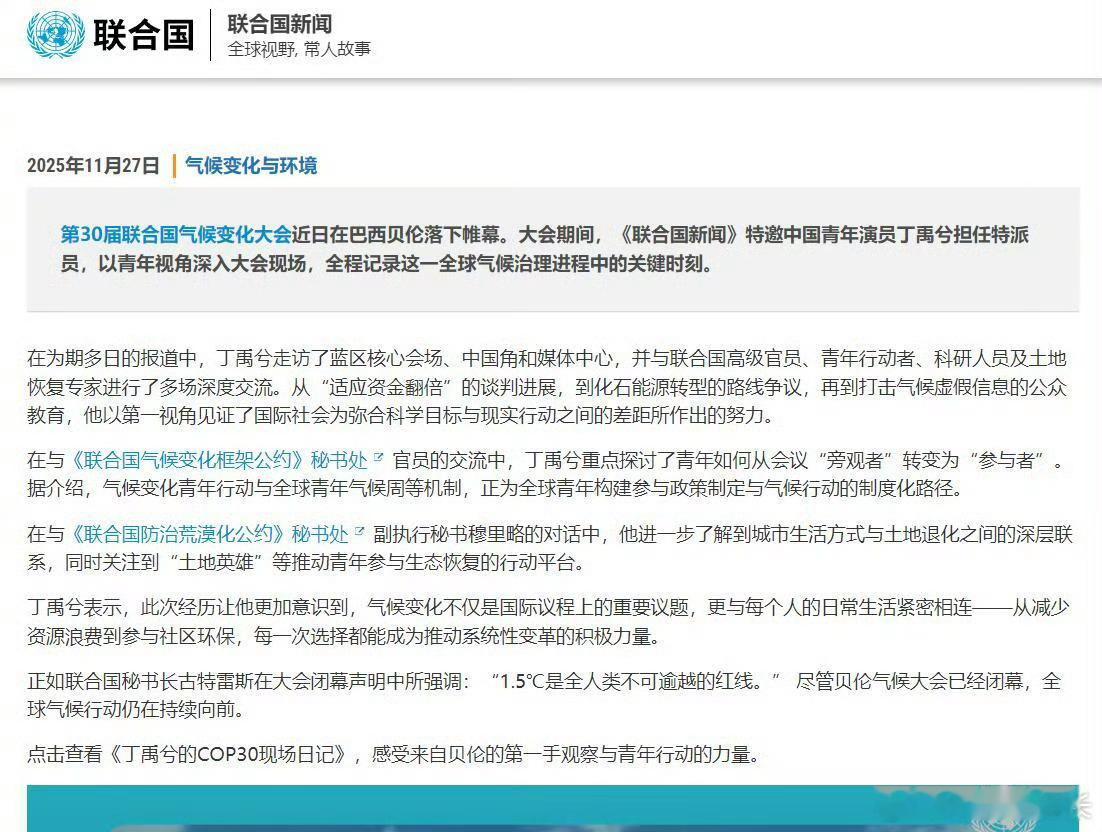 丁禹兮登联合国新闻版头丁禹兮正能量艺人正能量艺人!丁禹兮登上联合国官方新闻版头