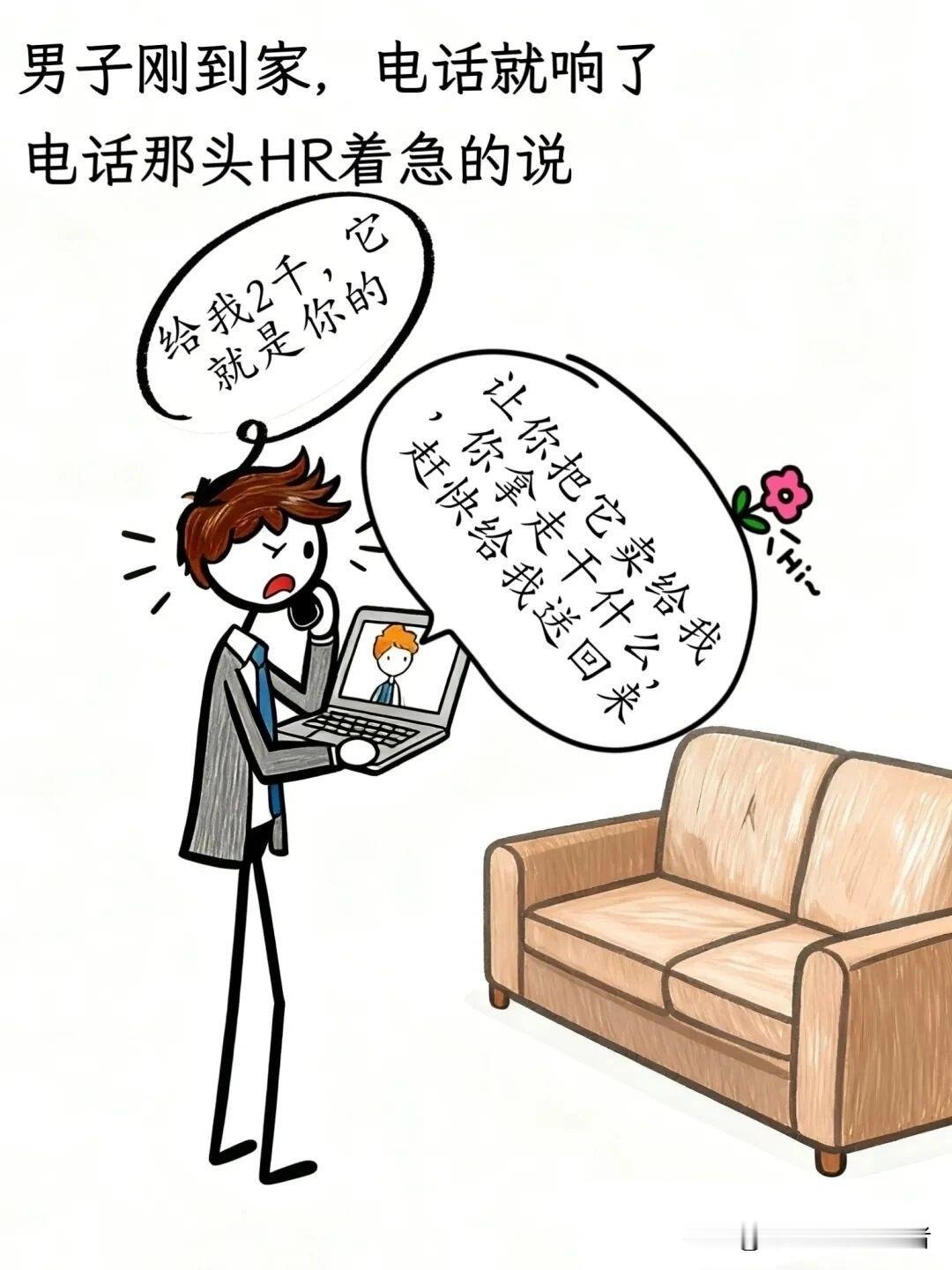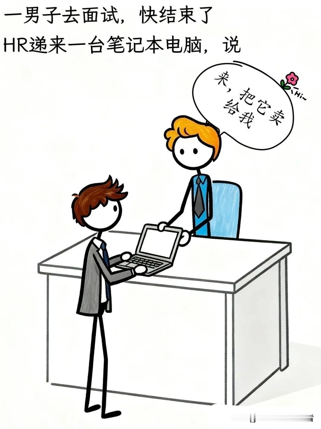 趣味漫画:一男子去面试,HR递来一台笔记本:卖给我。男子抱起电脑就往回走。刚到家,电话响了:快还回来!男子:给我2千,它就是你的