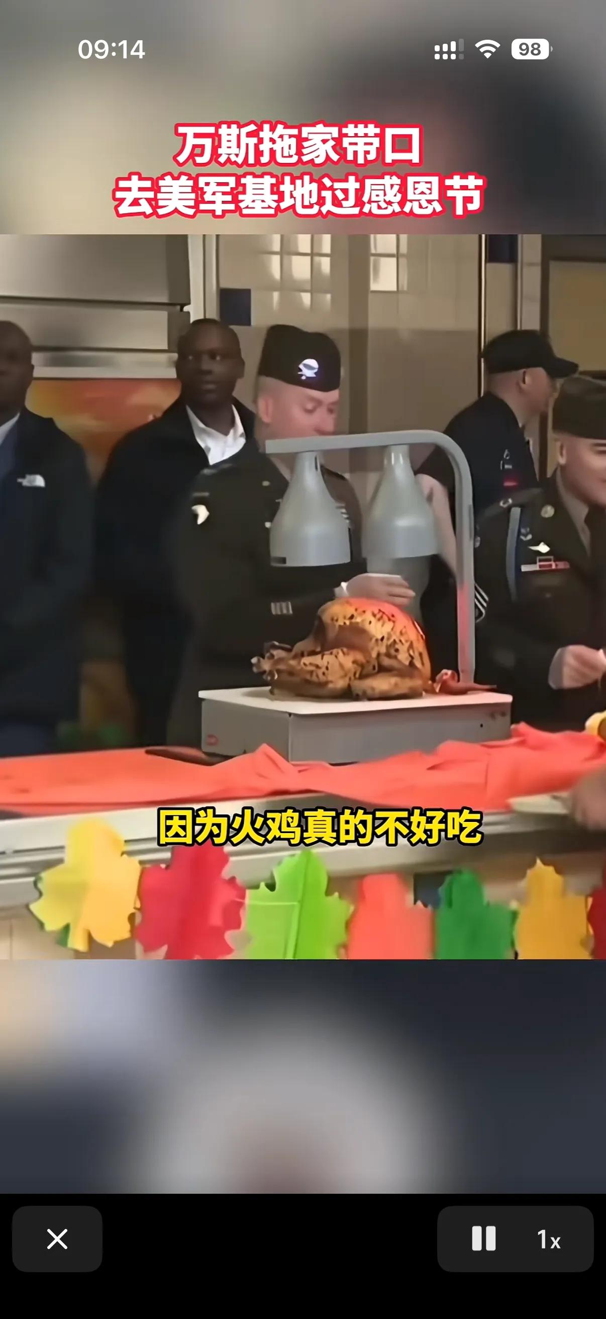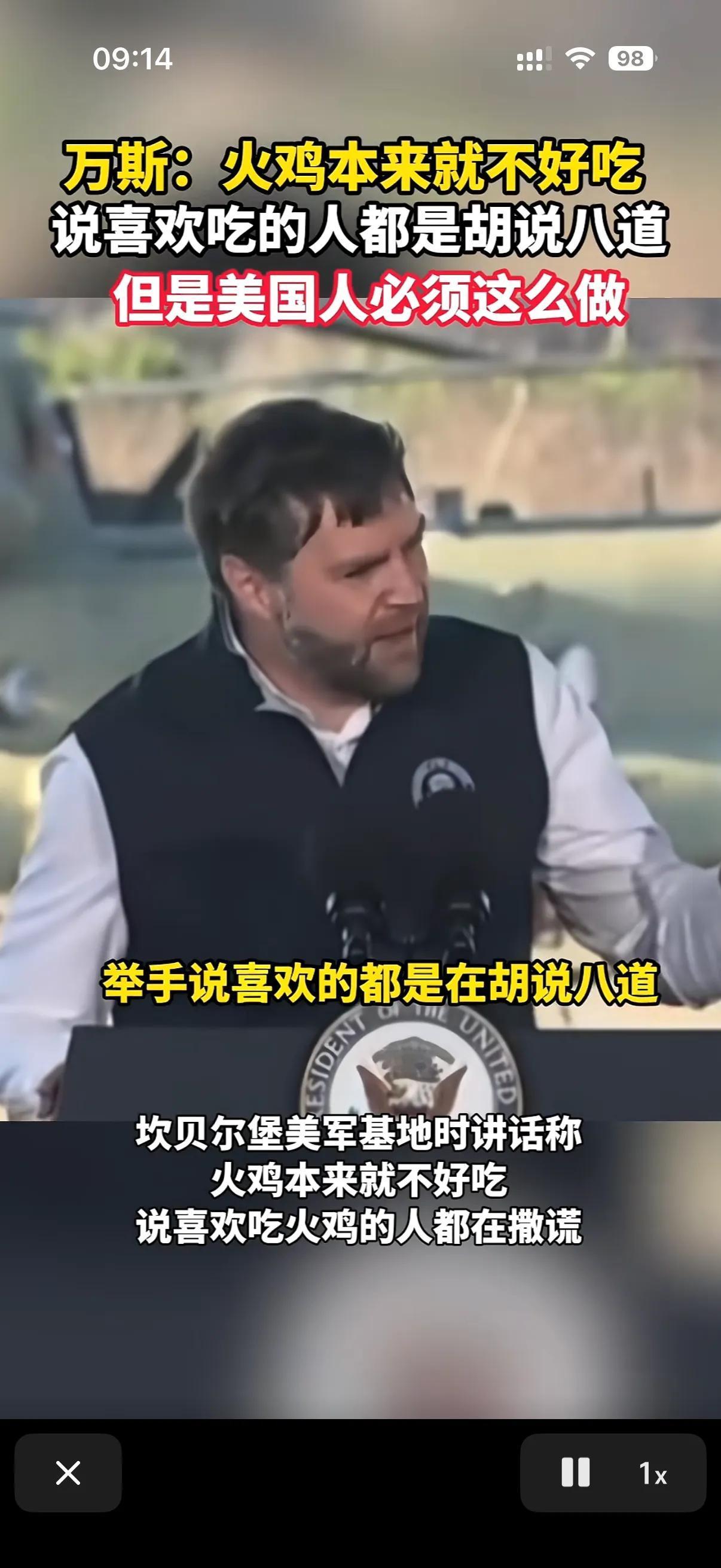 美国火鸡是最难吃的! 在感恩节当天,万斯在参加美国军队在坎贝尔堡的美军基地讲话时声称,火鸡一点也不好吃,凡是说火鸡好吃的都是在胡说八道,但是没哟拌饭,感恩节这天吃火鸡已经是美国的节日不可分割的一部分,所以大家今天才会聚在这里吃火鸡! 今年万斯上台以来,一直都给人塑造说实话和敢说实话的形象,可以说万斯说出了很多美国人的心里话,比如感恩节必须吃火鸡这个传统,在感恩节的时候火鸡卖的比平时还贵,关键确实不好制作和不好吃!