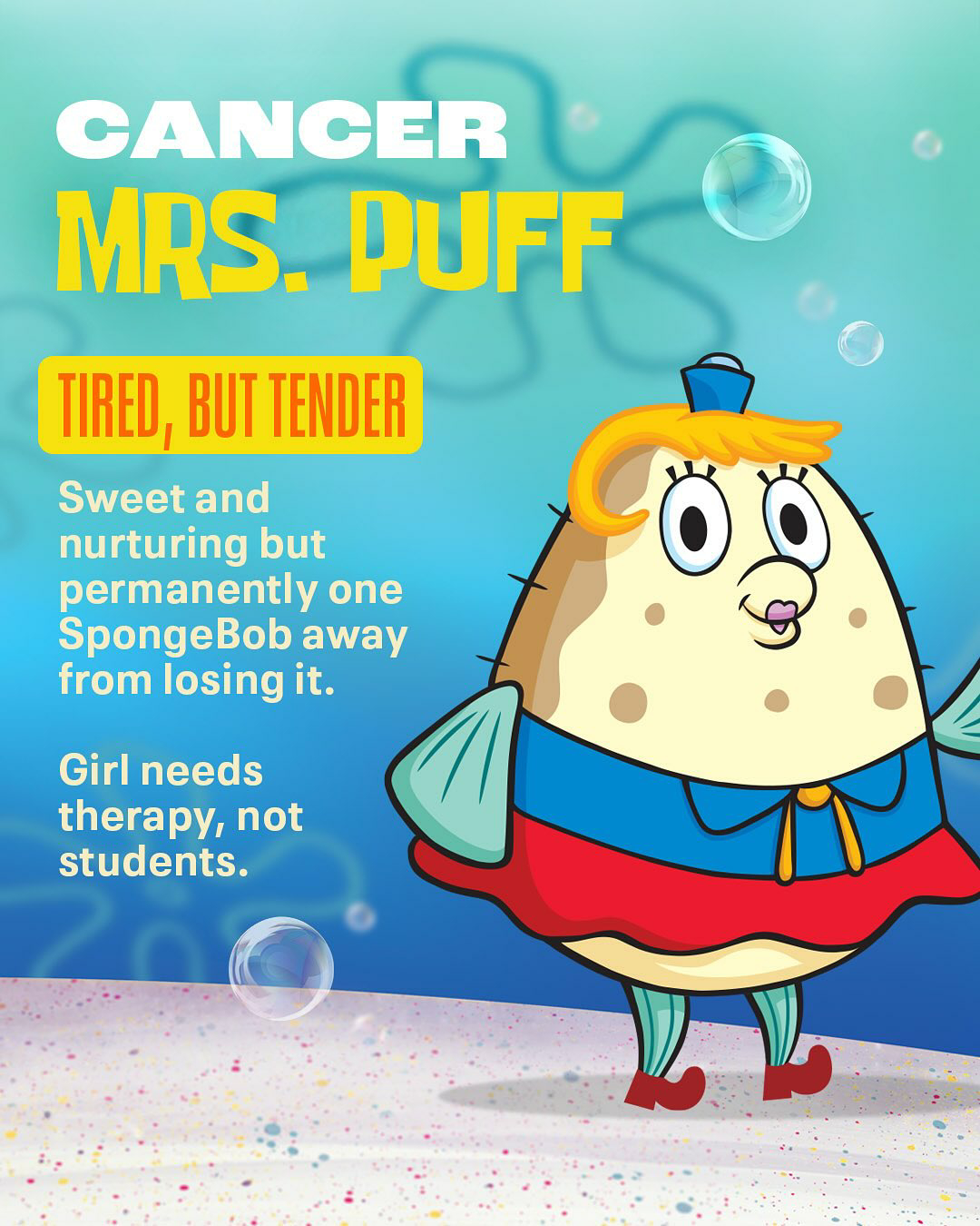海绵宝宝公布各角色星座!看看你跟谁的一样?• 海绵宝宝 - 双子座 • 派大星 - 射手座• 章鱼哥 - 金牛座 • 珊迪 - 白羊座 • 蟹老板 - 摩羯座• 痞老板 - 天蝎座 • 泡芙老师 - 巨蟹座 • 珍珍 - 狮子座 • 凯伦 - 处女座 • 美人鱼战士 - 天秤座 • 泡泡人 - 水瓶座 • 小蜗 - 双鱼座