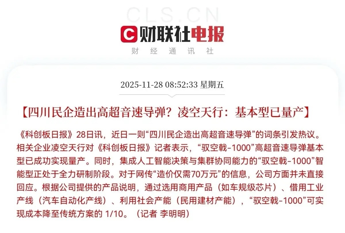 今日据《科创日报》最新消息,一家四川名企凌空天行居然造出了高超音速导弹,基本型号“驭空戟”-1000高超音速导弹基本已经成功实现量产,太厉害了,这家企业不得了,要一鸣惊人了,相信只要产品确实厉害,公司的高超音速导弹有威力,质量过硬,那么市场就会买单,订单就会源源不断,公司未来发展前景就会非常广阔,在这消息出来后,预计资本市场是不会错过这么好的机会的,相关凌空天行概念股要被抢筹了,值得重点挖掘……