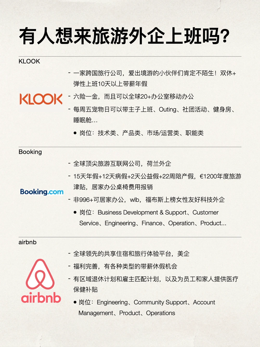 整理了一些做旅行业务的外企,发现一家比一家香!比如爱彼迎、Booking、Klook这些大家平时可能都用过的,都有很多不错的工作机会