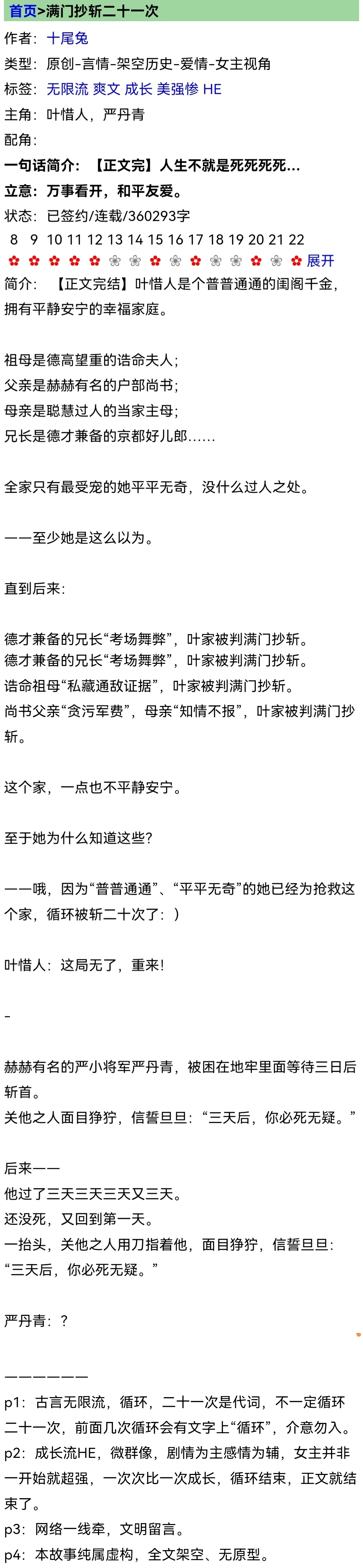 [种草R]故事背景架空大梁,有点类似于南宋,内忧外患,女主叶惜人是无忧无虑的户部千金,一开篇发现自己陷入了满门抄斩的循环。为了保住自己和家人的性命,试过好言相劝无果,到打断哥哥的腿,对父亲下毒,暴力的创死每个坏人……在一次次绝望无效中,认识到同样循环的男主严丹青,她虽然不懂救国的大道理,却在见识到他的大义后,开始深思熟虑,和男主一起携手破局,最终破了循环走到了一起。