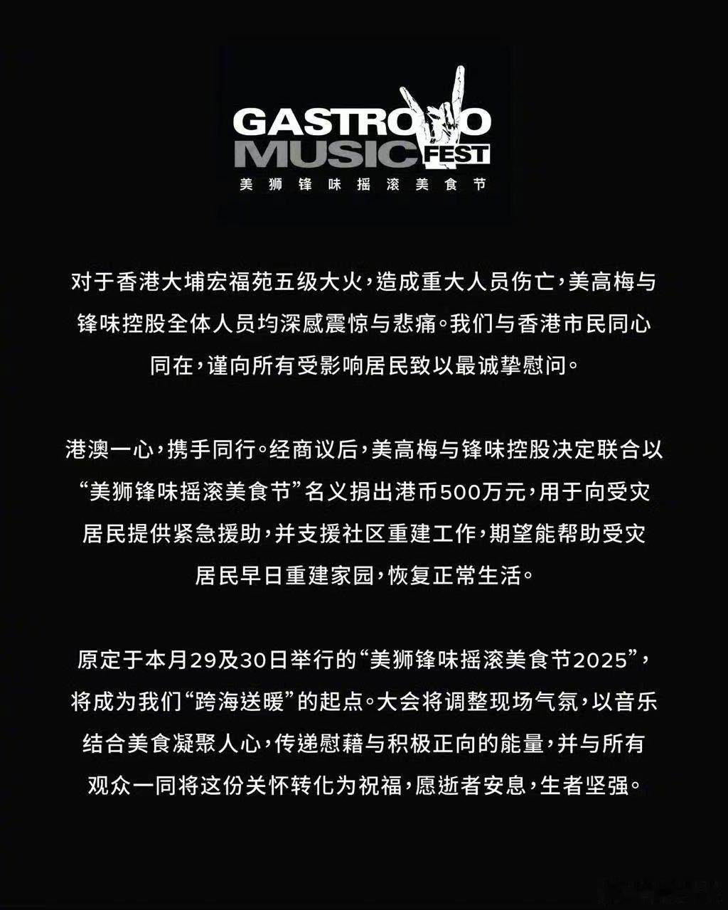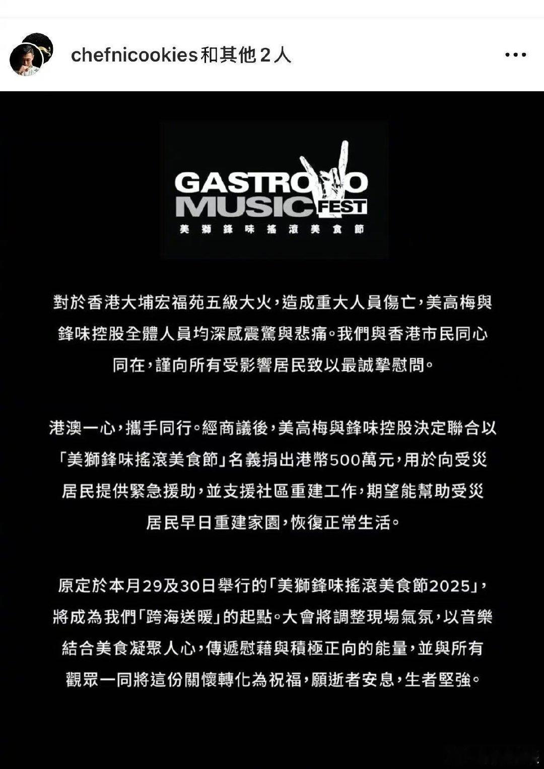 谢霆锋何超琼为香港火灾捐款500万 以爱驰援香港受灾同胞 跨企业联手,以美食节之名行公益之举。500万港币为受灾居民送去应急保障与重建希望,愿和消防英雄、志愿者们一起,守护香港烟火,静待雨过天晴。