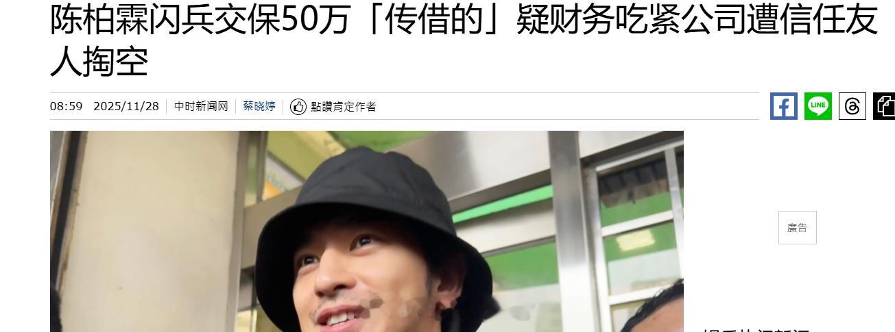 陈柏霖逃兵役借款50万交保?台媒曝陈柏霖本来7月要和交往13年的庭瑄结婚,10月就卷入闪兵案,业界透露他担任董事长、成立6年的「无敌影业」其实最近也卷入财务危机,疑似被陈柏霖信任的朋友掏空,导致陈柏霖近来财务吃紧,交保的50万也要靠朋友帮忙借钱。这么惨了!!