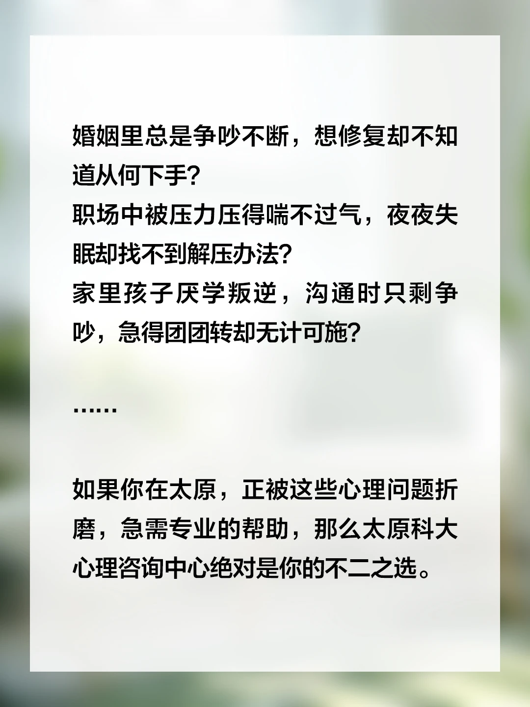 如果你在太原,正被这些心理问题折磨,急需专业的帮助,那么太原科大心理咨询中心绝对是你的不二之选。