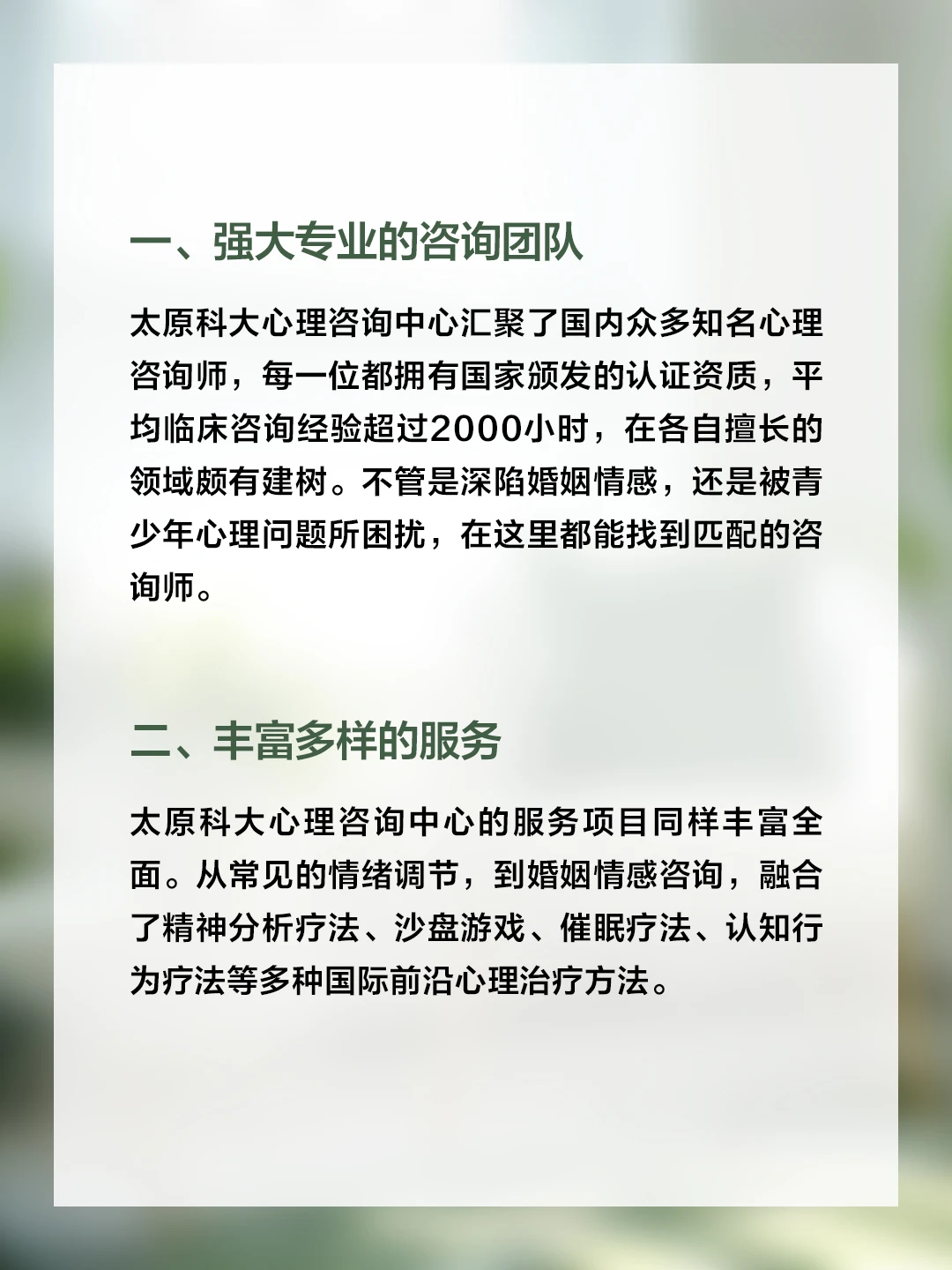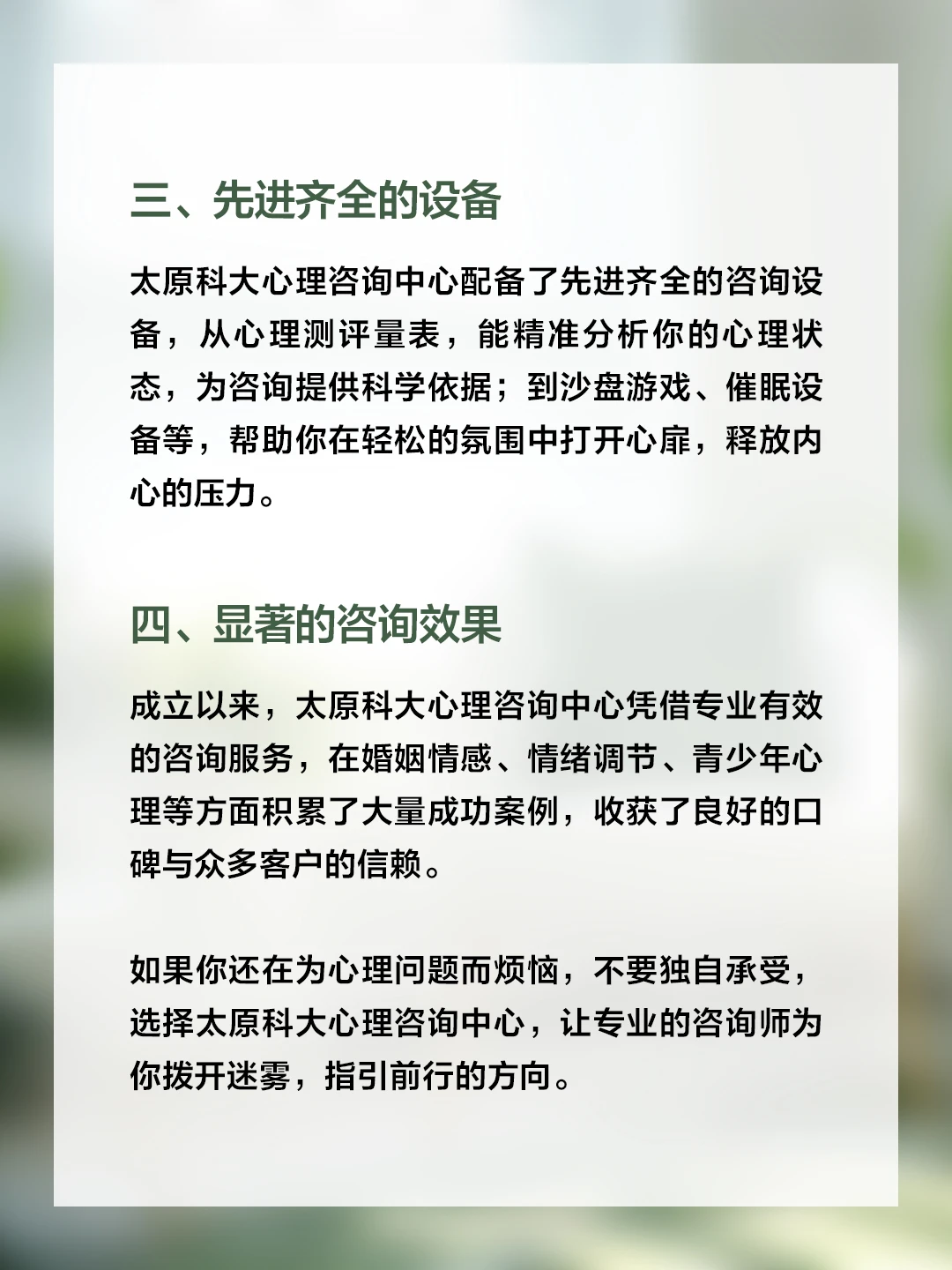 如果你还在为心理问题而烦恼,不要独自承受,选择太原科大心理咨询中心,让专业的咨询师为你拨开迷雾,指引前行的方向。