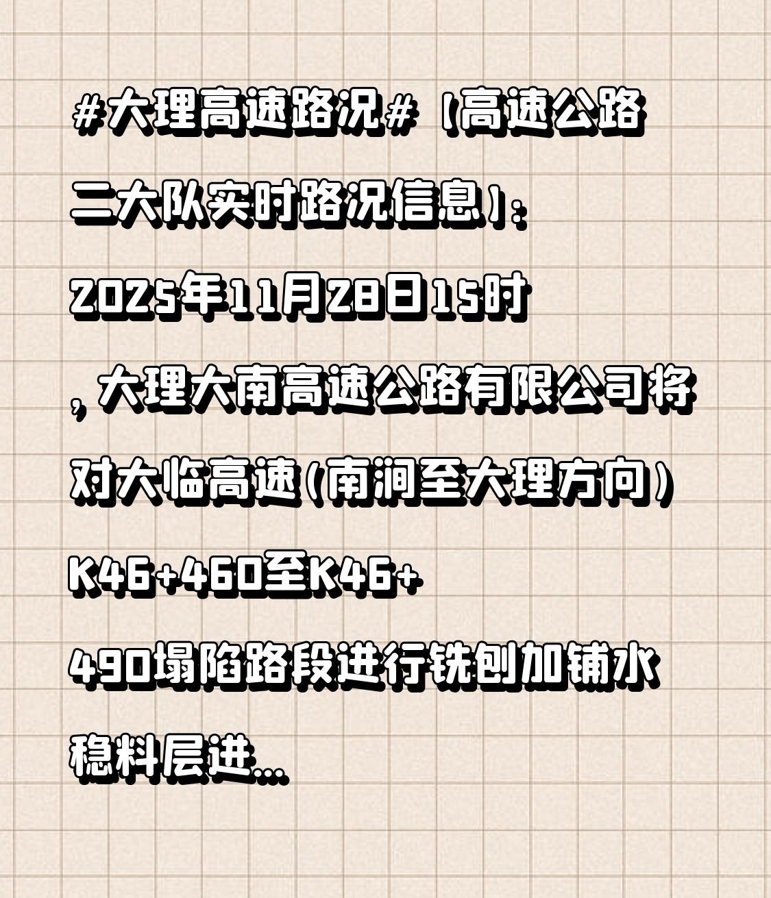【高速公路二大队实时路况信息】: 2025年11月28日15时,大理大南高速公路有限公司将对大临高速(南涧至大理方向)K46+460至K46+490的塌陷路段,开展铣刨加铺水稳料层的应急处理工作。施工期间,需对巍山南收费站至巍山北收费站路段(南涧至大理方向)进行短时间封路断交。 高速公路二大队一中队将于14时55分对该路段实施分流管控。高速公路交管二大队会组织警力,对施工现场路段进行临时交通分流,同时强化巡逻管控与警示提示。 分流期间,南涧往大理方向的车辆需从巍山南收费站驶出高速,绕行215国道后,再由巍山北收费站驶入大临高速。 大理路况