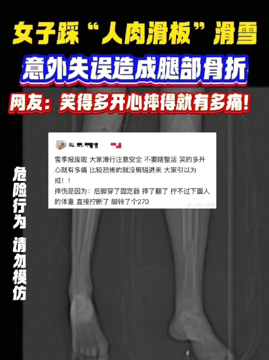 近日,广东。女子整活在雪场模仿踩人滑雪,操作失误造成腿部骨折…… 摔伤的原因是:后脚穿了固定器,摔了翻了,拧不过下面人的体重,直接拧断了,脚转了一个270°。 网友吐槽:当时笑的有多开心,过后摔的就有多痛!就问你刺不刺激?惊不惊喜?意不意外吧?[我想静静][我想静静][我想静静] 果然滑雪的尽头就是骨科!!!