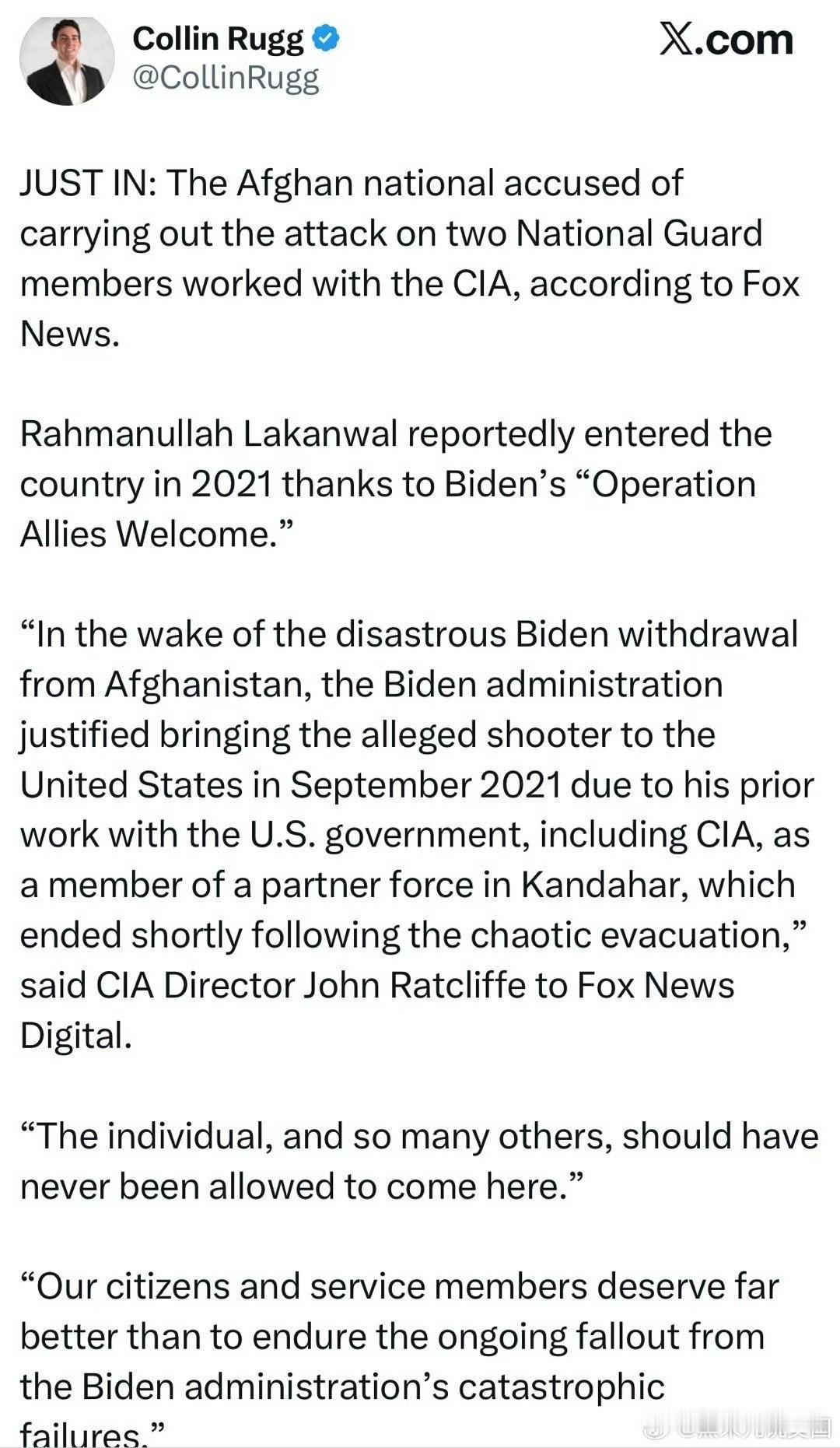 在首都向国民警卫队人员开枪的枪手,是美国中央情报局培训的阿富汗坎大哈特种部队成员,2021年由拜登政府带到美国。这样的背景,能猜到是什么动机。而左媒却在宣称,是因为人民对川普动用国民警卫队维护治安的做法不满,是反对暴政的表现。看来左左们所谓的反暴政,得依靠伊斯兰武装人员。