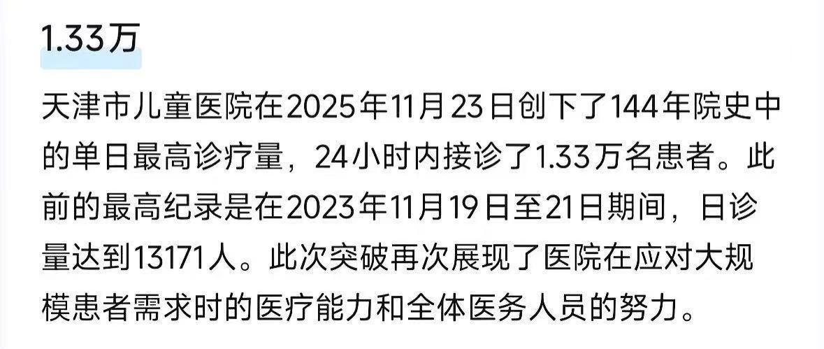 天津市检出新毒株H3N2! 天津市儿童医院在2025年11月23日创下了144年院史中的单日最高诊疗量,24小时内接诊了1.33万名患者。