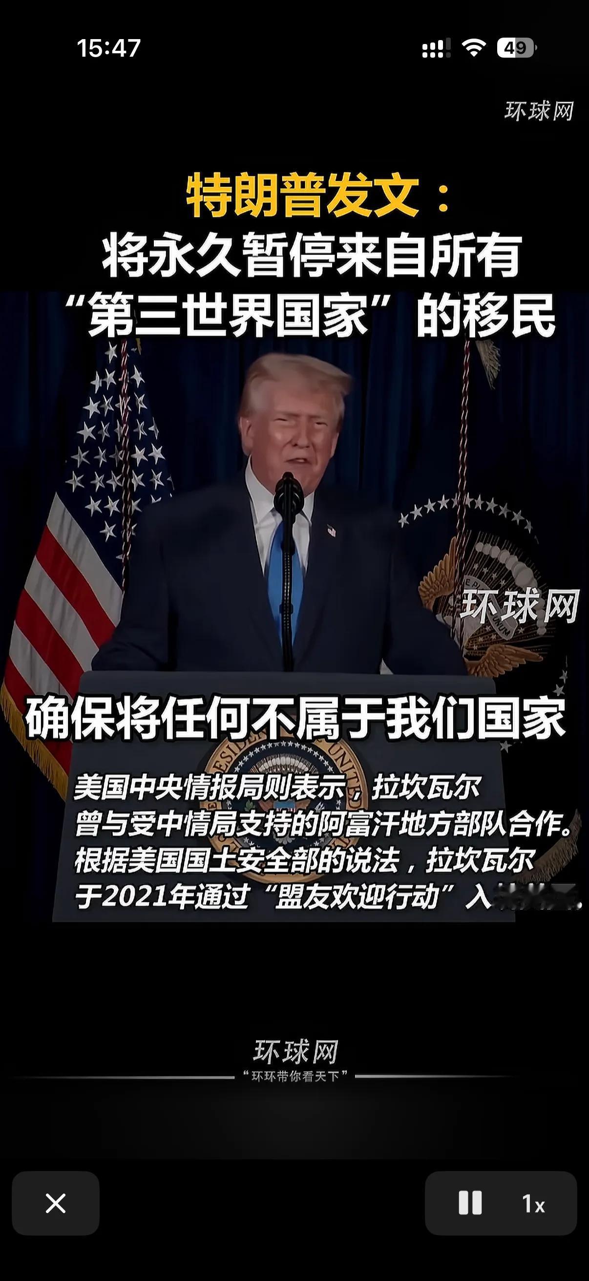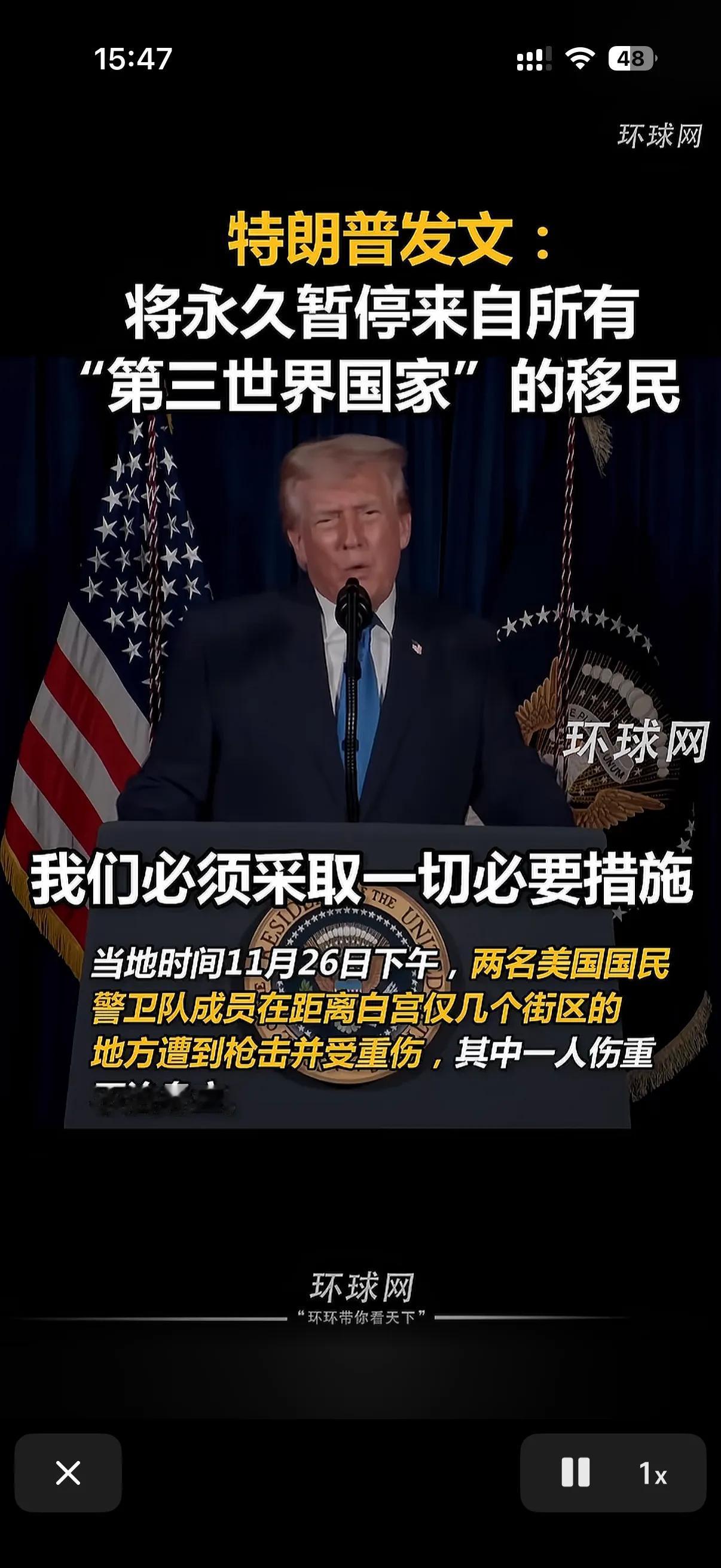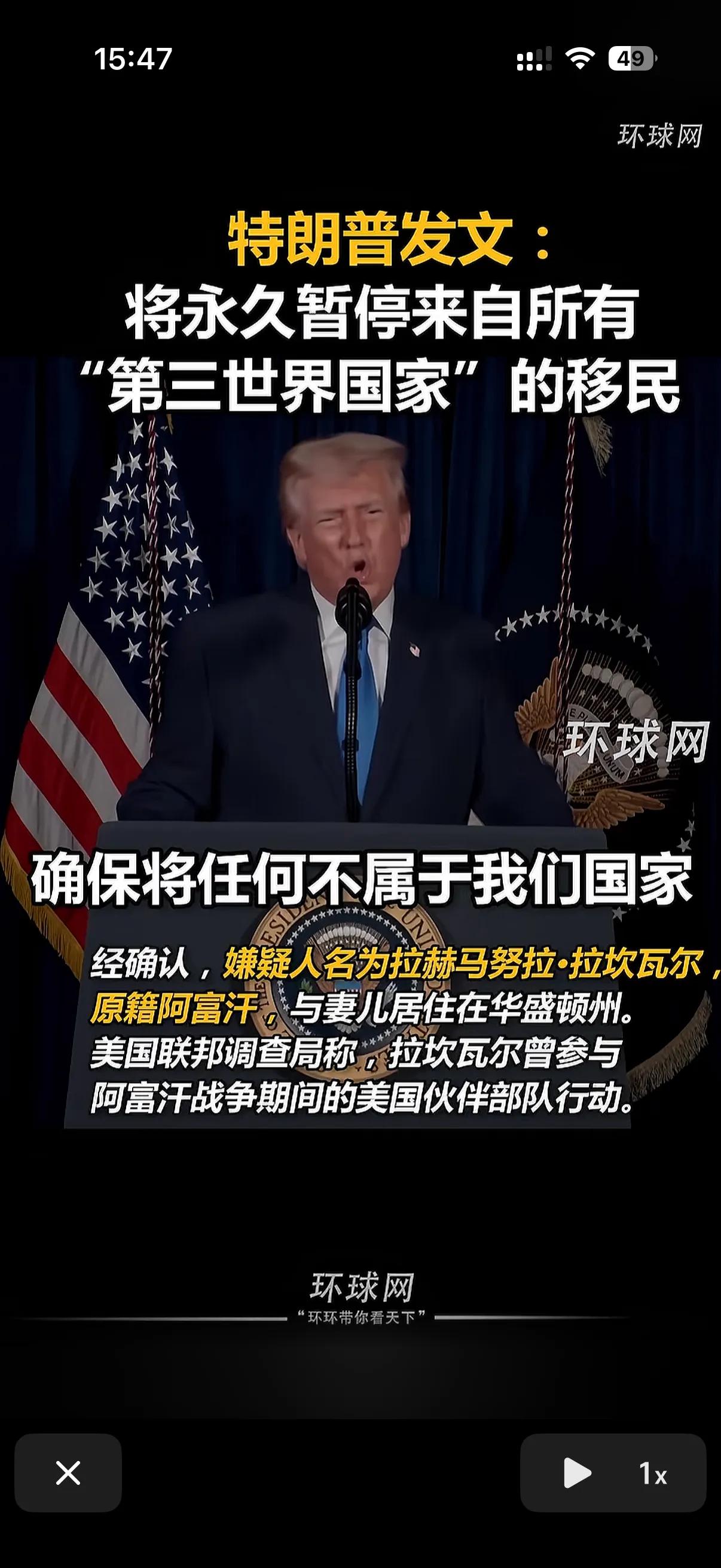 特朗普永久禁止第三世界国家移民,并且严查之前的移民! 因为查出来袭击白宫附近国民警卫队的人居然是美国引进额移民,还是美国的庇护人员, 特朗普表示很震怒! 特朗普发表讲话声称以后将永久禁止第三世界国家移民美国! 并且还将严查之前的第三世界移民过来的人员,如果不能给美国创造财富,不符合移民政策的必须都驱逐出境! 可以说特朗普的这条政策可以说是美国历史上最严厉的移民政策了! 将会堵上不少人想要移民美国的路子,以前不少人想要利用第三世界国家移民美国,现在是彻底没希望了! 而且不只是针对第三世界国家的移民,其他国家的移民一旦判定是对美国无意义的不能创造价值的也将会被驱逐!