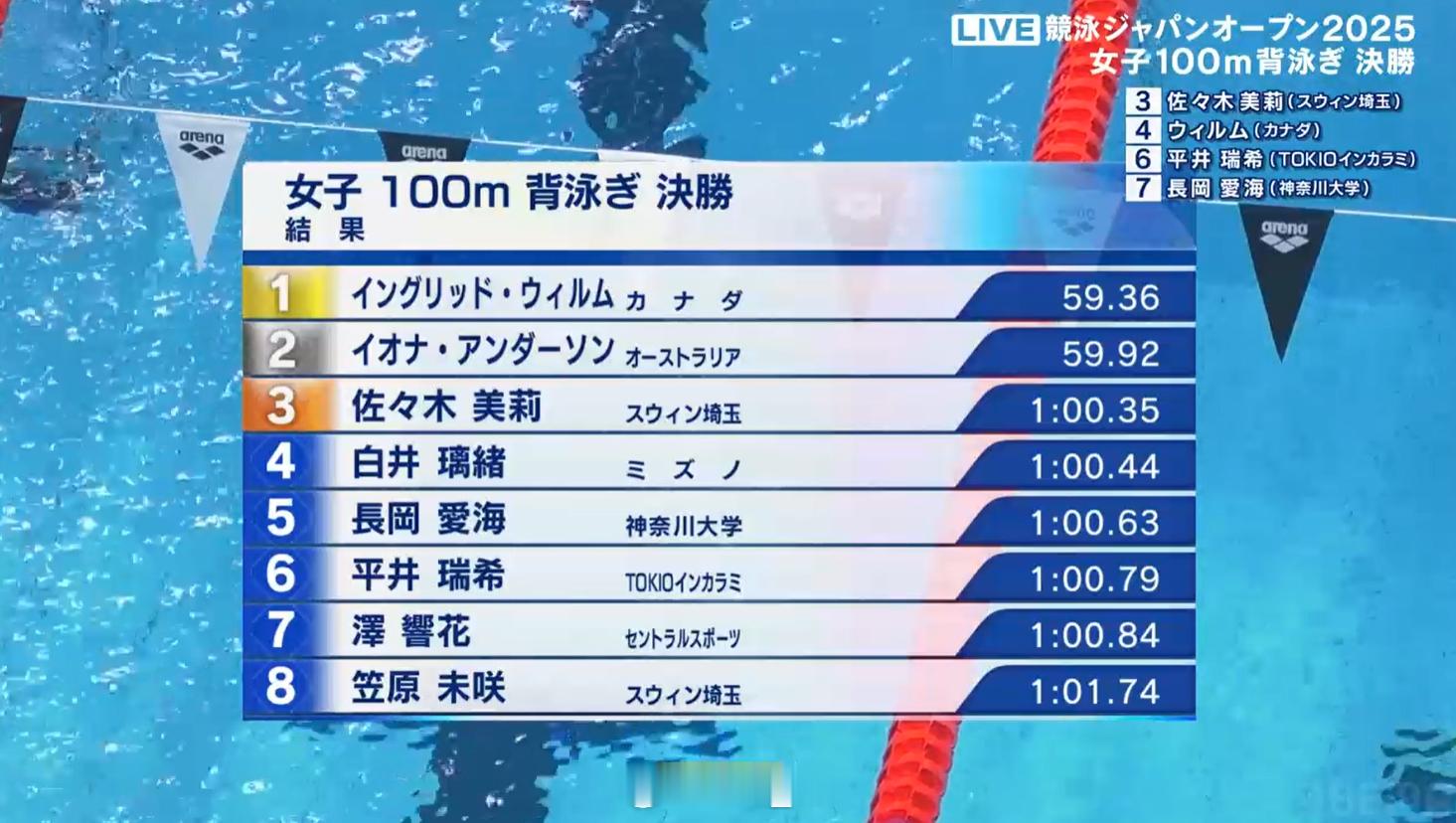 日本游泳公开赛 女100仰决赛Ingrid Wilm 59.36Iona Anderson 59.92