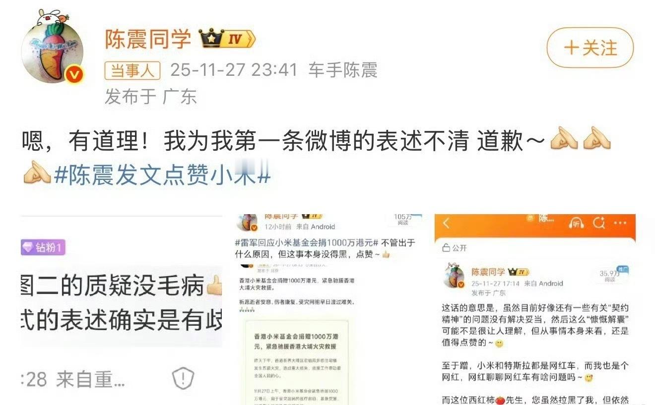 陈震 小米陈震为表述不清道歉 谁懂啊!陈震和小米的瓜能从车圈吃到社会新闻!小米捐1000万救灾本是好事,他非要来句“不管出于什么原因”,被批“眼里只有流量没有灾情”,就算辩解是因为旧怨,也掩盖不了抖机灵的事实,这道歉怕不是为了下一波蹭热度铺路?小米小米汽车