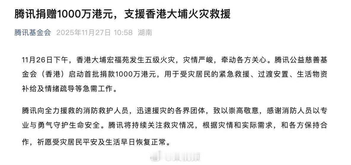 香港大火已致94人遇难比亚迪,小米,马云,腾讯,字节跳动等都捐款了!水火无情人有情!希望香港同袍平安渡过难关!