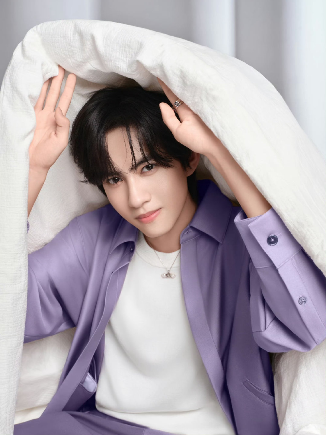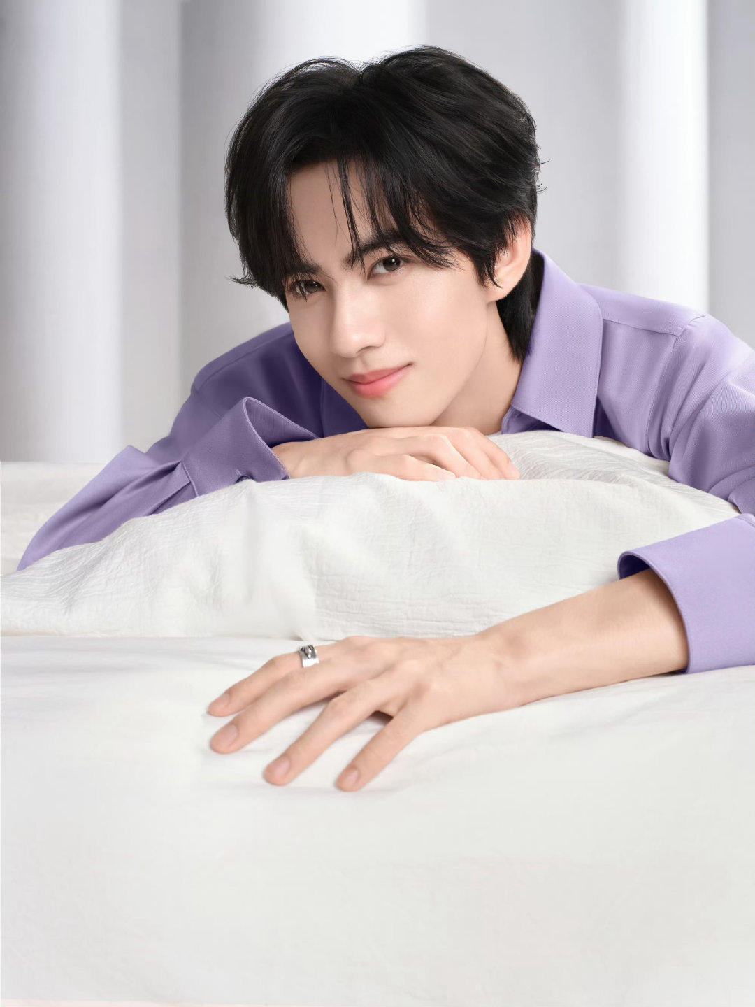 刘轩丞|品牌宣传海报更新,上身紫色衬衫,搭配珍珠项链,温润贵公子