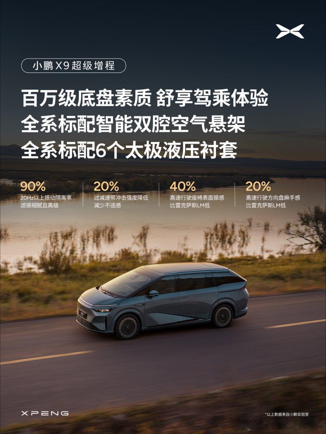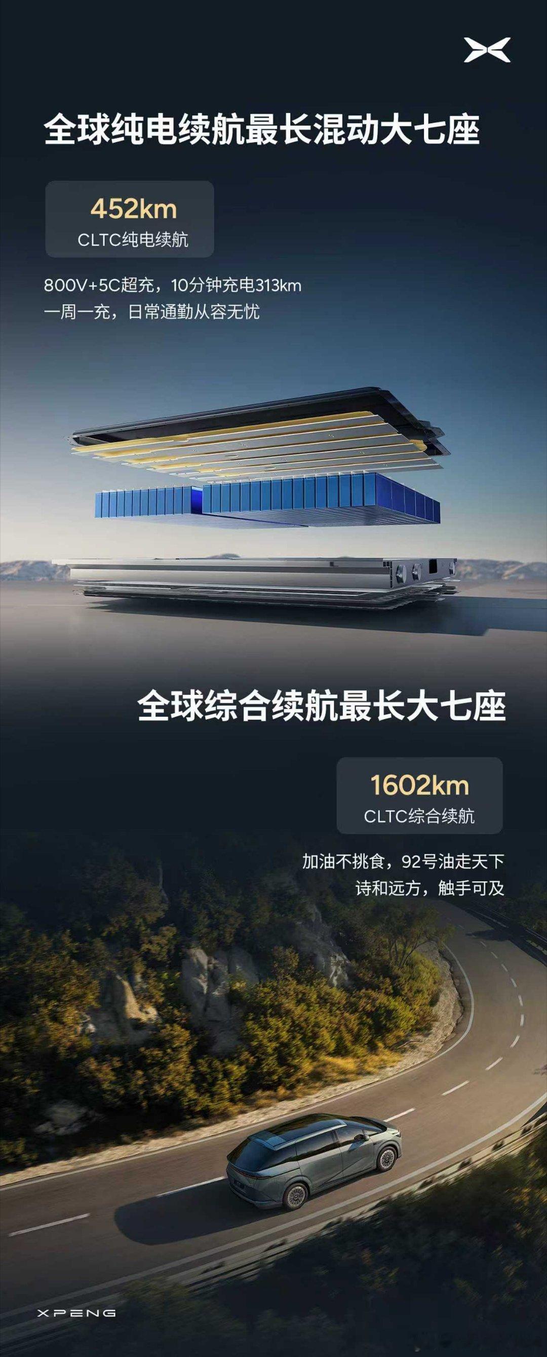 2025那些让你怦然心动的新车大电池混动香在哪里肯定是刚刚发布的小鹏X9超级增程版了。小鹏X9增程版之所以能让人怦然心动,首先是大电池混动技术,这个并不是简单的增程,而是把纯电的技术全方面的赋予了增程汽车。为什么做好纯电才能做好增程?纯电车这些年技术的进展远超增程车,因为纯电没有额外的补能装置,首先需要更苛刻的电耗表现来维持续航。所以纯电车一直在卷驱动电机功率,卷800V高压,卷周边电气设备的省电,卷热泵空调,卷极致的热管理,把每一份能量都充分的利用上,甚至包括冬季驱动电机的热量,包括芯片的微弱热量,也能被回收为乘员舱与电池的保温能量。这也做到了WLTC下综合油耗百公里仅仅2.53L!!亏电油耗也仅仅5.5L/100km,同级最低!传统增程车的电池包都比较小,一般都是在40度左右就已经很好了,甚至有的车企更低。既然有油箱“兜底”,车企就不需要追求电池技术,也省了研发的钱。纯电会倒逼技术突破,没有退路,不容易产生技术惰性。纯电车企在电池热管理系统、快充技术、安全防护等方面投入显著。最后小鹏X9增程版配备63.3kWh超快充磷酸铁锂大电池+60L大油箱的组合,在CLTC工况下实现纯电续航452km,综合续航1602km的全球领先水平:腾势D9 DM-i:纯电续航190-236km,综合续航1450km岚图梦想家PHEV:纯电续航235-350km,综合续航约1411km别克GL8陆尊PHEV:纯电续航202km,综合续航1450km这意味着用户在日常通勤中完全可当作纯电车使用,按日均50公里计算,充一次电可满足9天通勤需求,每公里成本低至0.1元,大幅降低用车经济负担。而60L大油箱的加持,使得长途旅行无需频繁补能,覆盖各类出行场景,彻底告别续航焦虑。此外,补能也解决了传统增程汽车的痛点。在5C+800V超充架构,充电12分钟即可补充70%电量;同时即使在SOC剩余3%的情况下,仍能保持150km/h的高速稳定巡航。增程器启动噪音大是困扰用户的行业共性难题,小鹏X9增程版采用超静谧无感增程器设计,结合ENC主动降噪技术,增程器启动和停止时的抖动下降60%,介入噪音控制在0.5dB以内!实现了媲美纯电版的驾乘体验。小鹏X9增程版通过全球唯一的"9合1超集成后桥设计",实现了工程学上的重大突破,后桥空间利用率高达95.8%。这一创新设计将以下九大核心部件高度集成于后桥空间:排气系统、60L大油箱、后轮转向系统、三排消失折叠收纳系统、双腔空气悬架、CDC减震器、电驱系统、独立H悬架、传动轴总成。采用全球首发的"三排电动三折叠"技术,支持多种收纳方式。第三排座椅支持4/6比例电动折叠放平,形成纯平地面,可灵活切换4座、5座、6座、7座多种布局,即便在常规状态下,后备箱容积也高达510L,使得7座MPV堪比5座中型SUV的储物空间。Ultra版搭载3颗图灵AI芯片,算力高达2250TOPS,也同样是量产车目前最高的算力,未来几年升级无忧。另外这次最重要的以安全作为重点,极限工况+7人满载全车总重达3.324吨,通过最严苛的爆胎测试:160km/h 积水路面爆胎!150km/h 同侧双轮爆胎!120km/h 模拟冰面爆胎 !主动安全AEB/AES更是高达130km/h。还有10cm雪坑动力后轮脱困,防侧滑冰雪稳行系统。电池更是满足26年国标,电芯热失控下24小时不起火,不爆炸。更是拥有2000J远超国标的最高电池防冲击标准。无论是续航、能耗、智能,还有安全,空间都几乎没有什么弱点了。完美解决了家庭用户的核心痛点,同时提供了超越同级的科技体验、后轮转向便利性和空间灵活性。超级车主汽场全开小鹏汽车