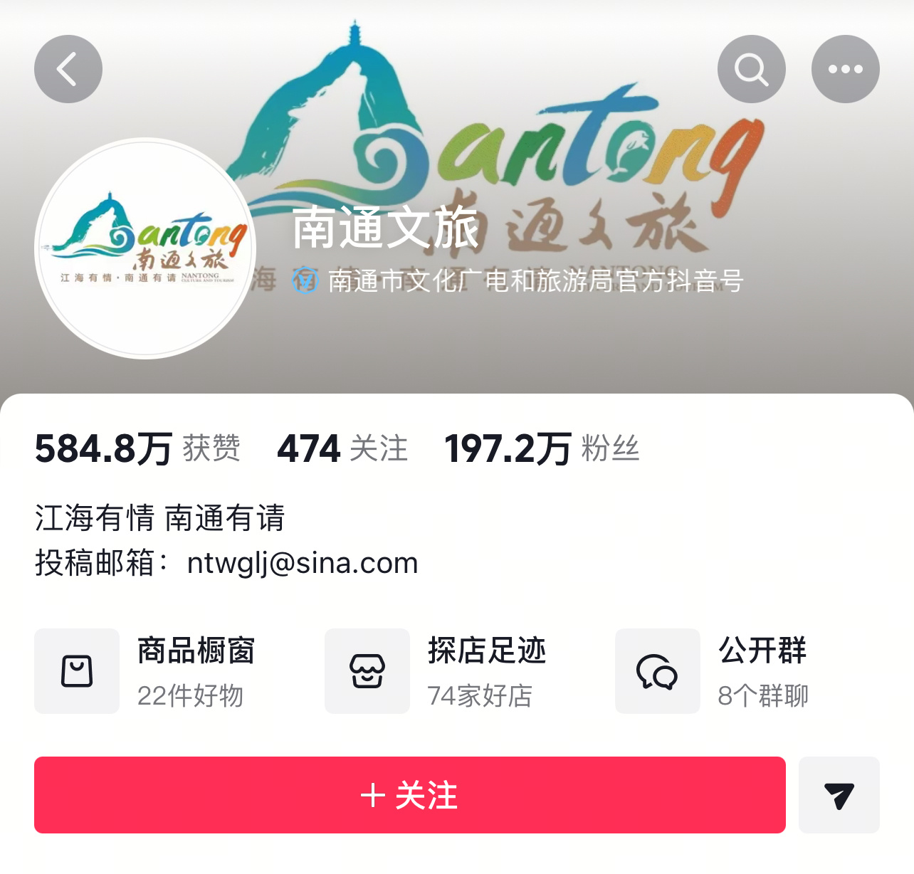 南通文旅的简介:江海有情 南通有请这事有热度后,也有几个文旅号秒跟,但随后都自行删除了南通文旅粉丝破百万