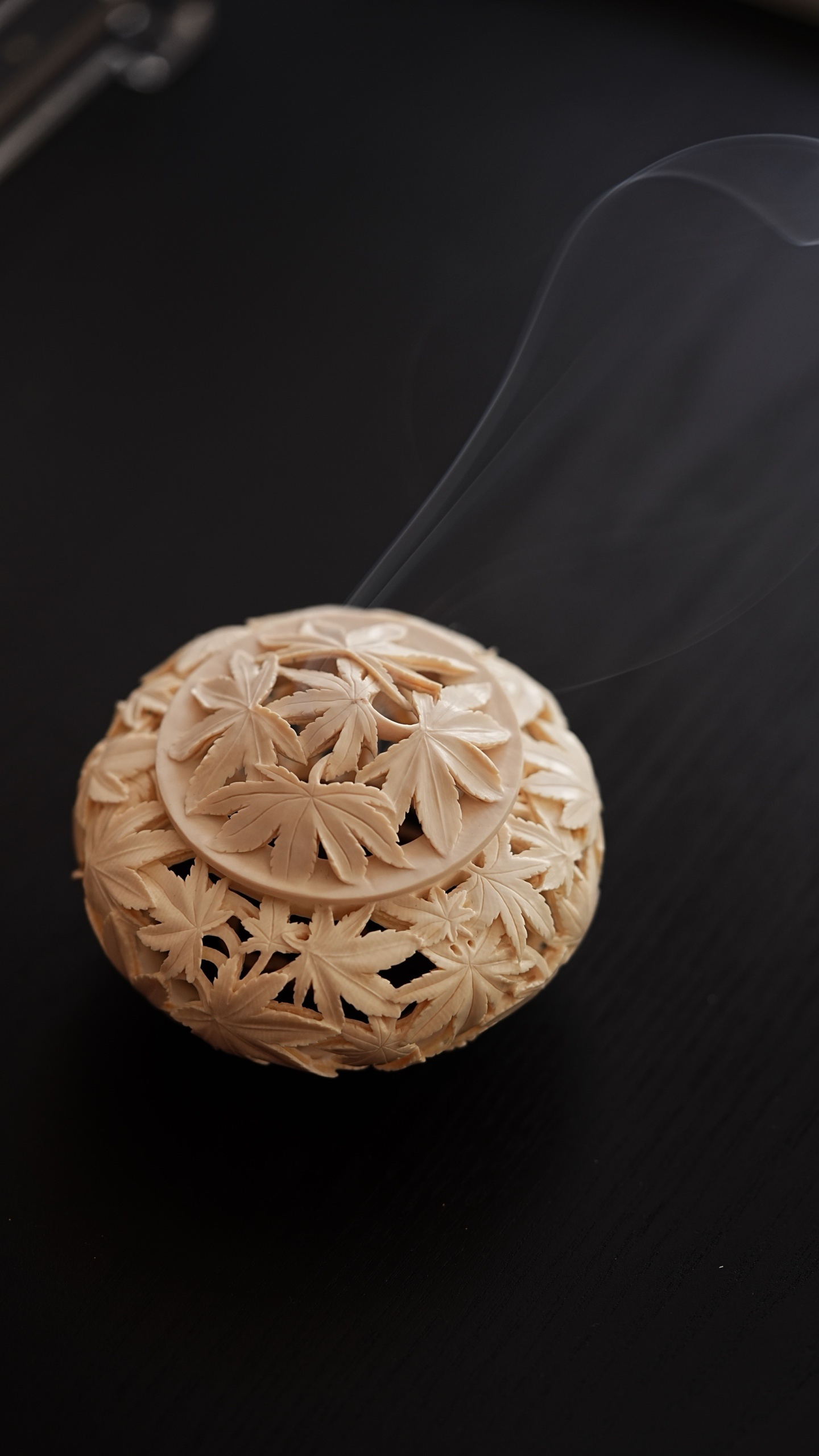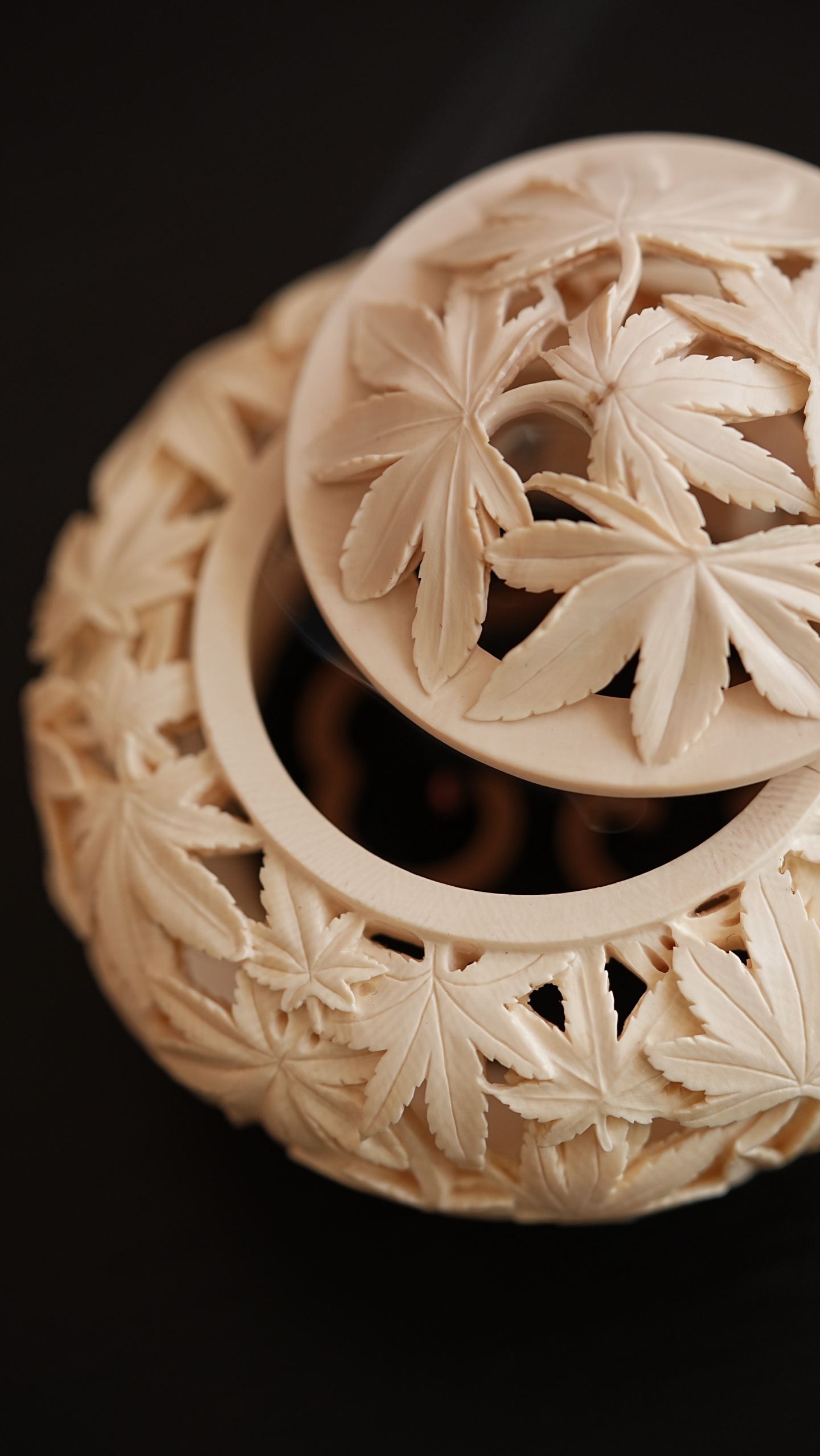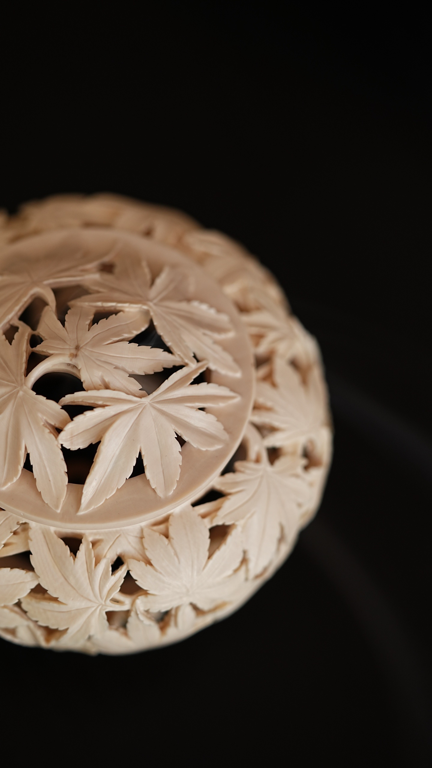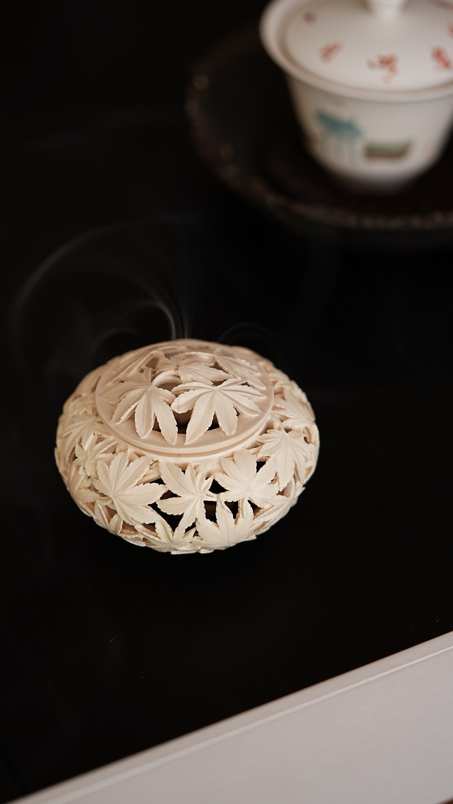 猛犸象牙 | 镂空枫叶 琴炉炉身满工镂空,枫叶层叠翻转,叶脉相连,构成繁复通透的视觉盛宴。刀法玲珑剔透,光影流转间,尽显秋意之绚烂与冰河遗珍之温润,乃案头赏玩之雅器。8.2*5.9cm 66.3g