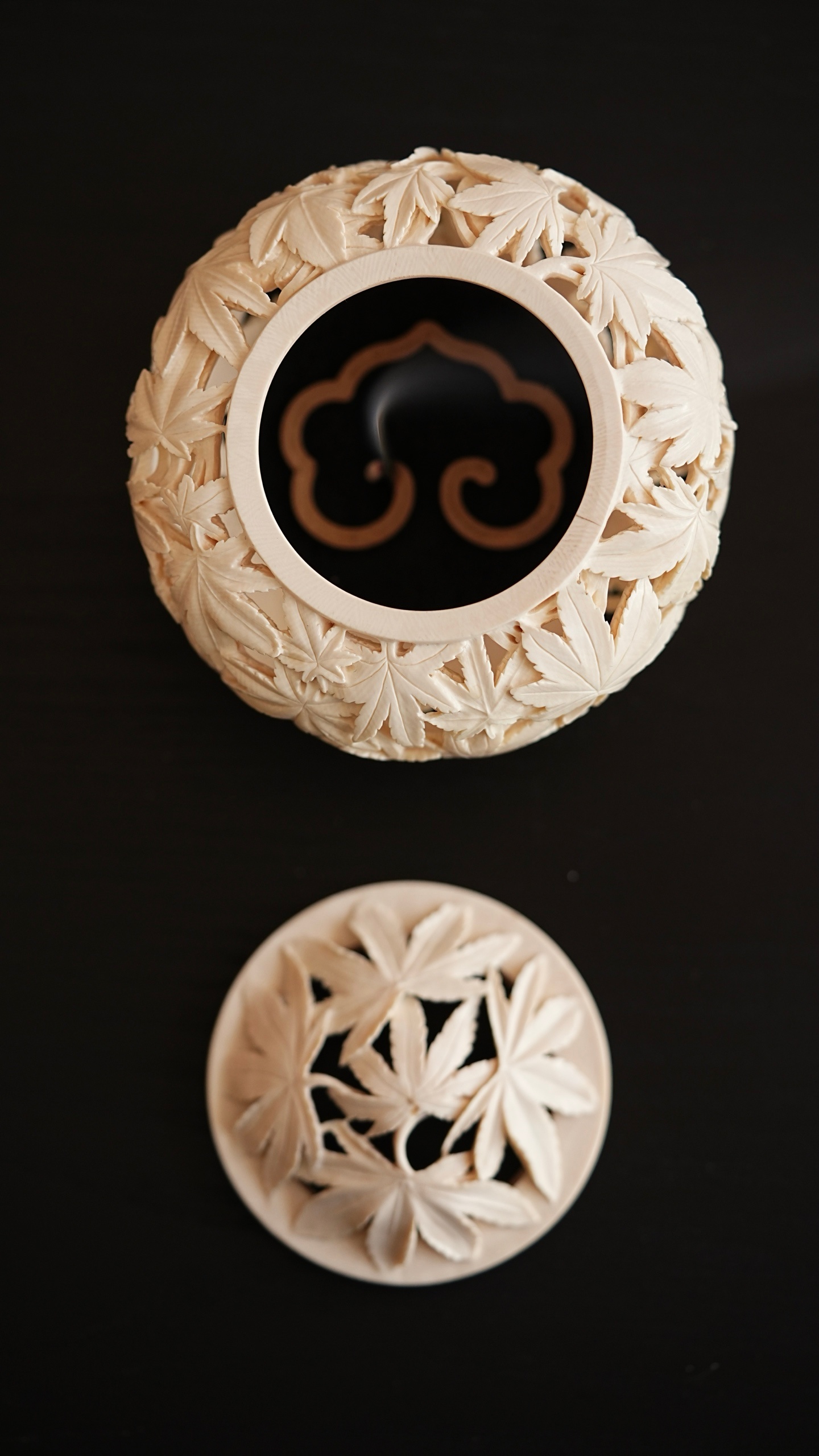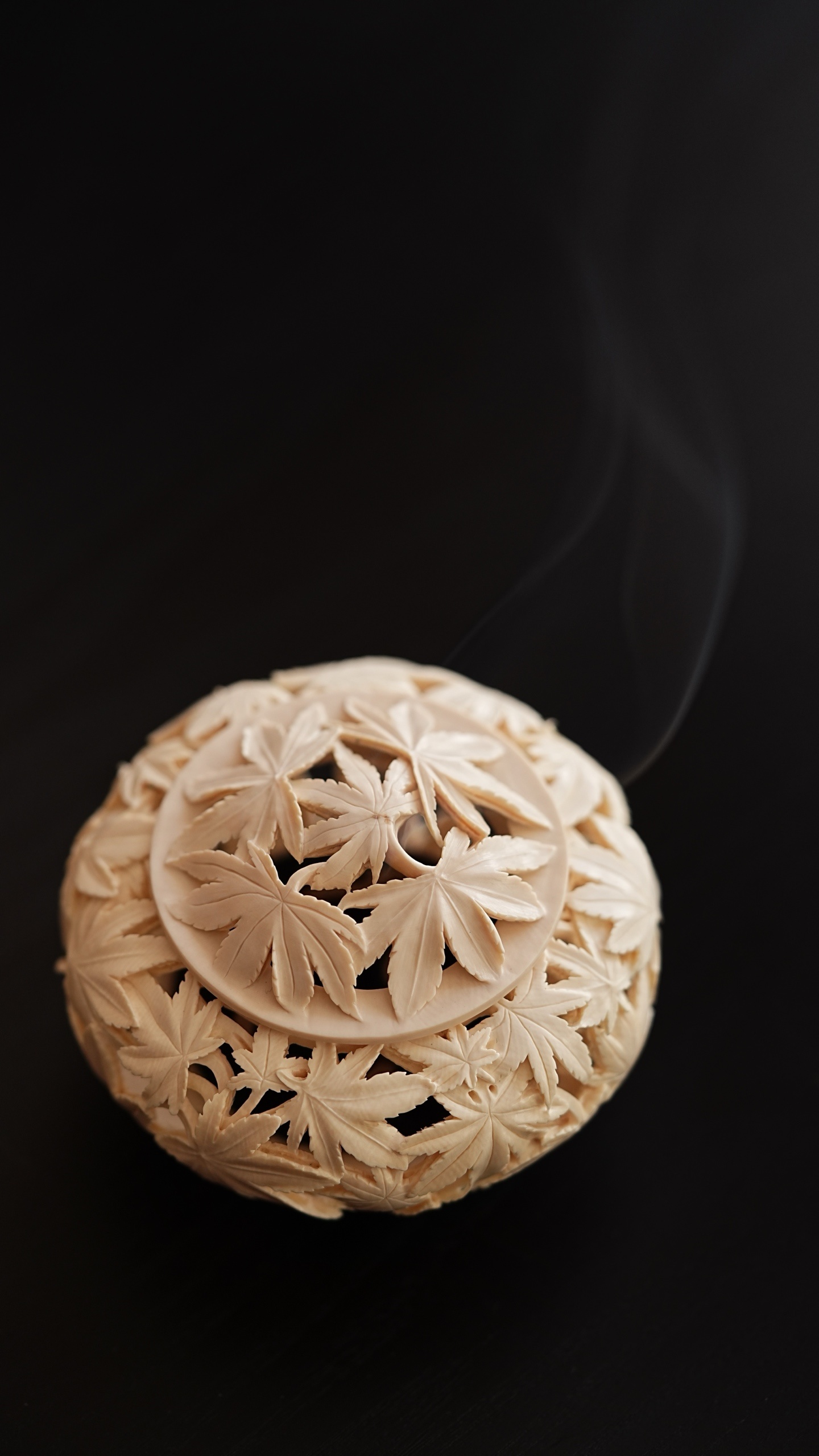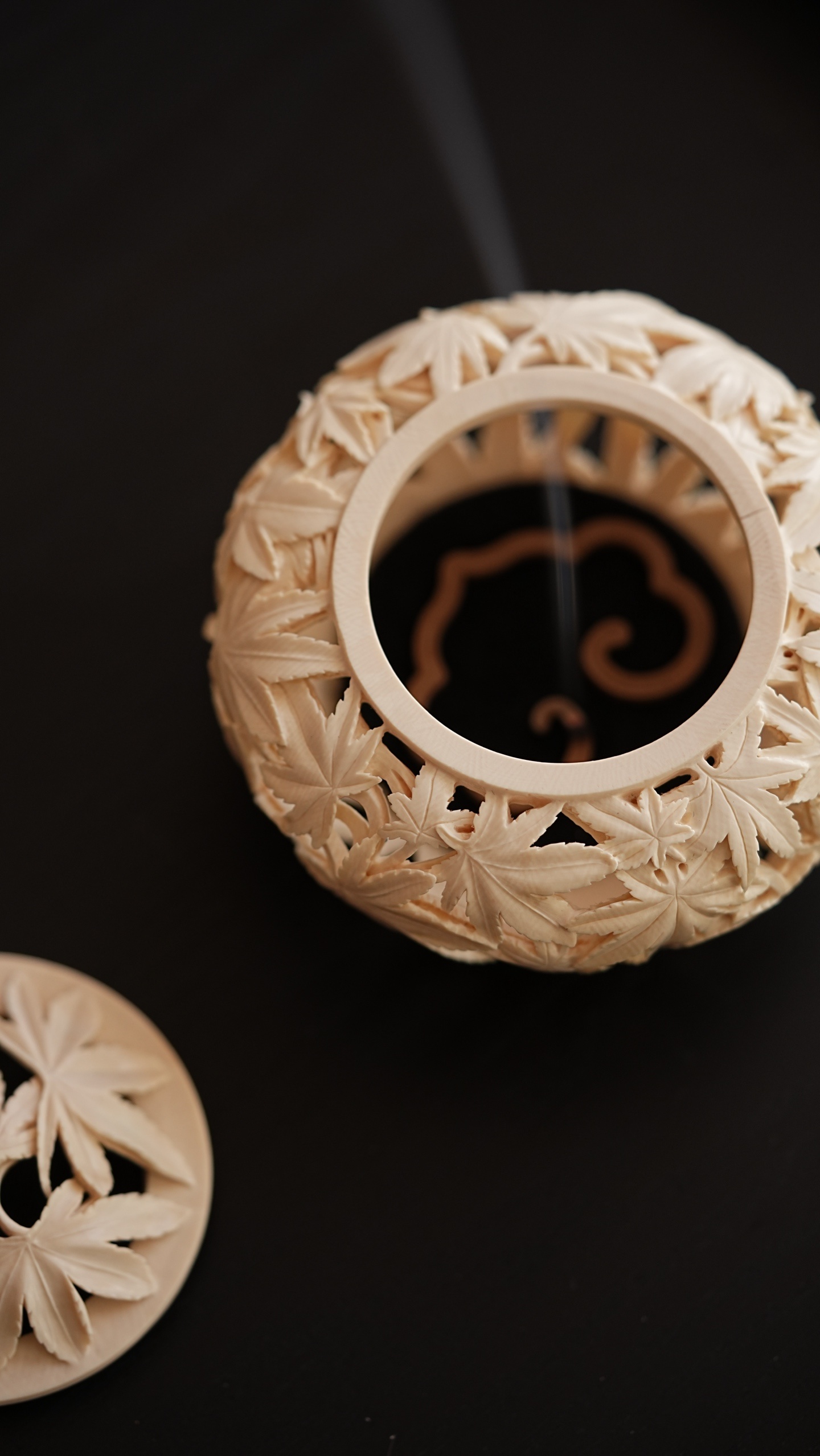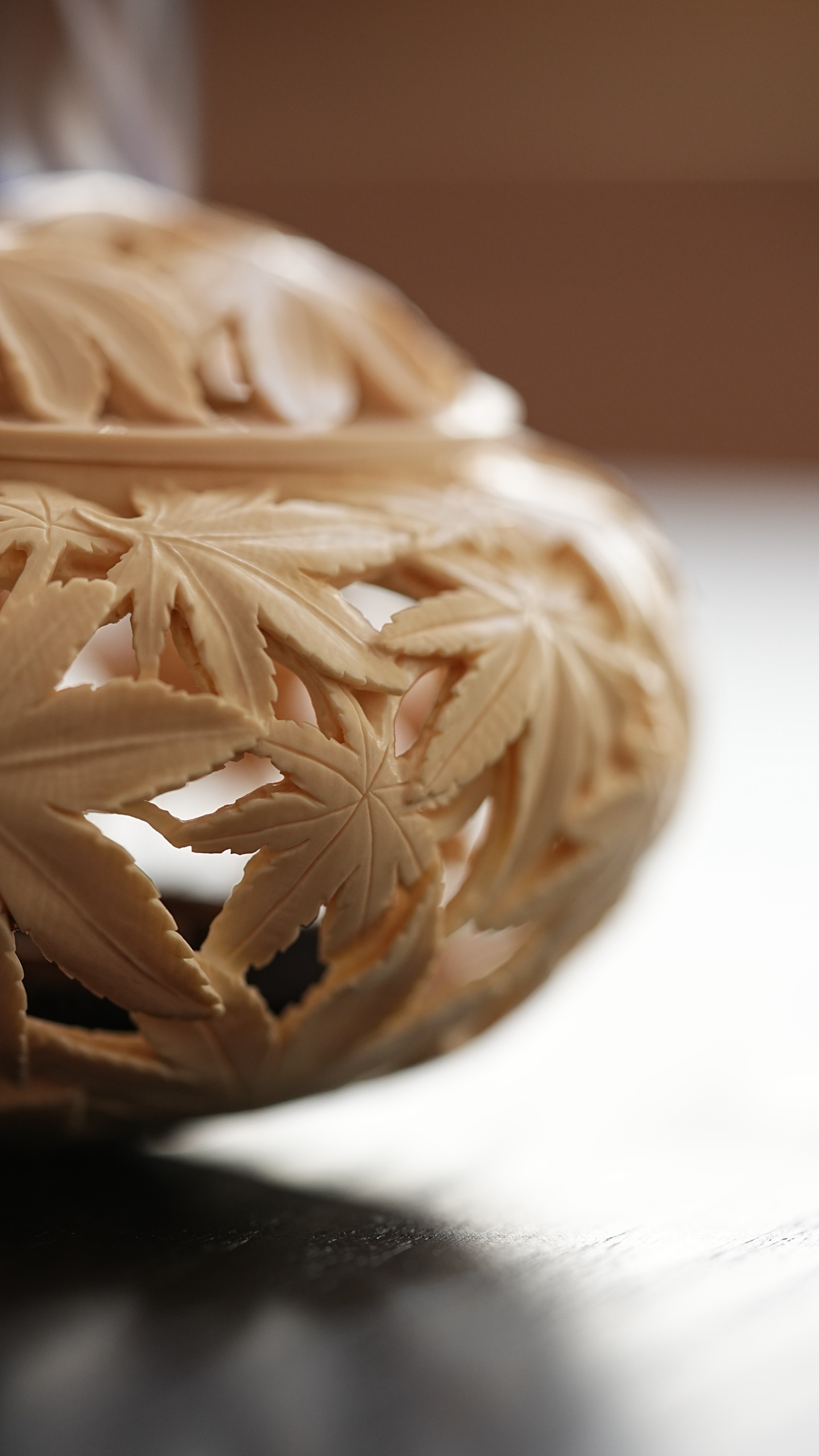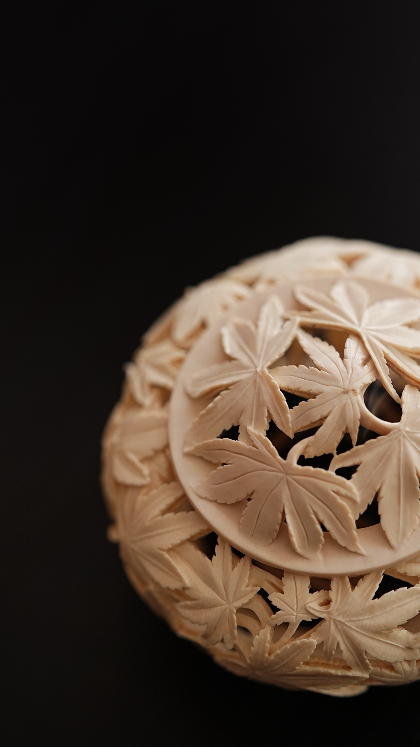 猛犸象牙 | 镂空枫叶 琴炉炉身满工镂空,枫叶层叠翻转,叶脉相连,构成繁复通透的视觉盛宴。刀法玲珑剔透,光影流转间,尽显秋意之绚烂与冰河遗珍之温润,乃案头赏玩之雅器。8.2*5.9cm 66.3g