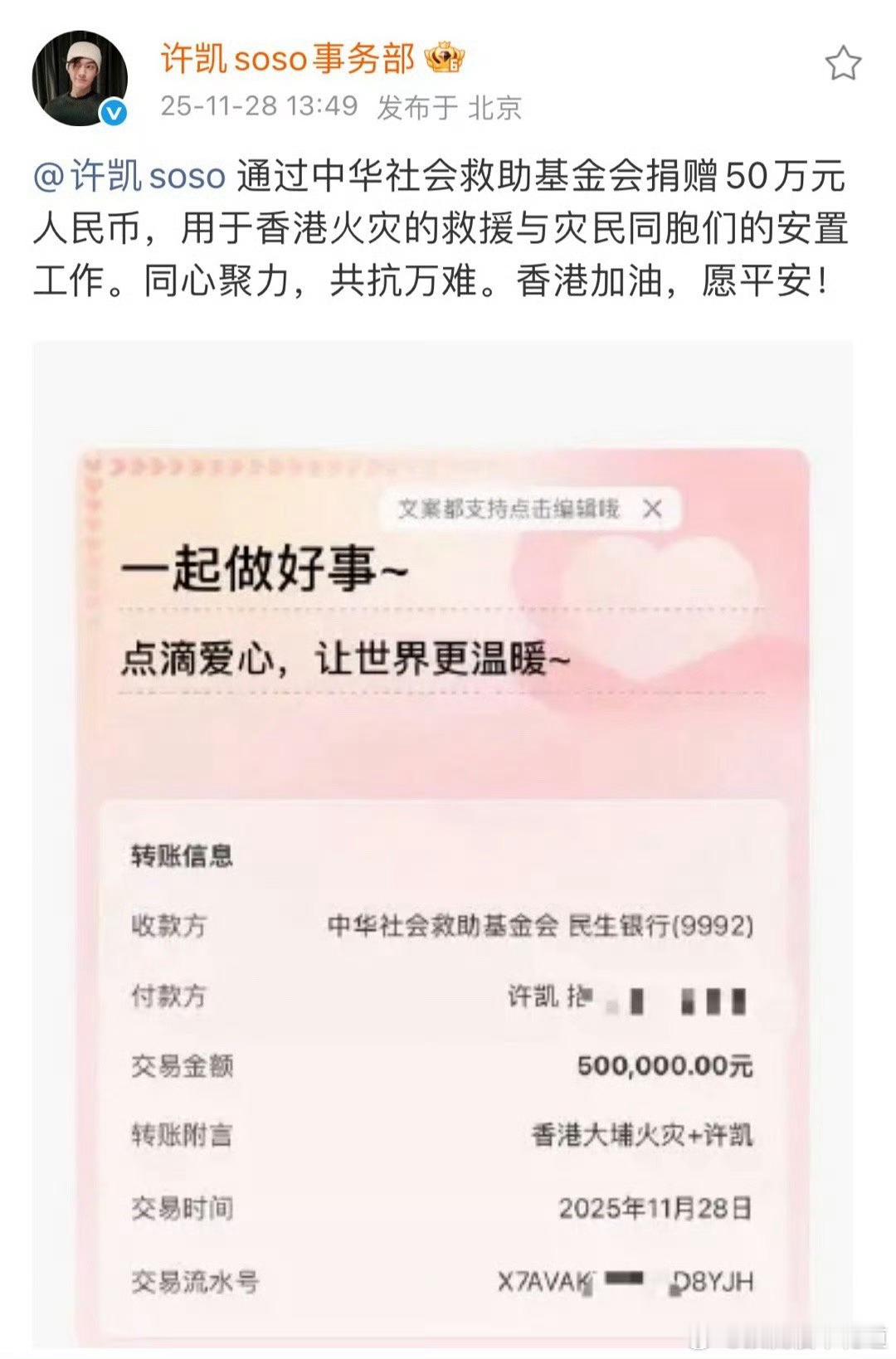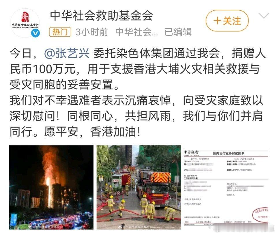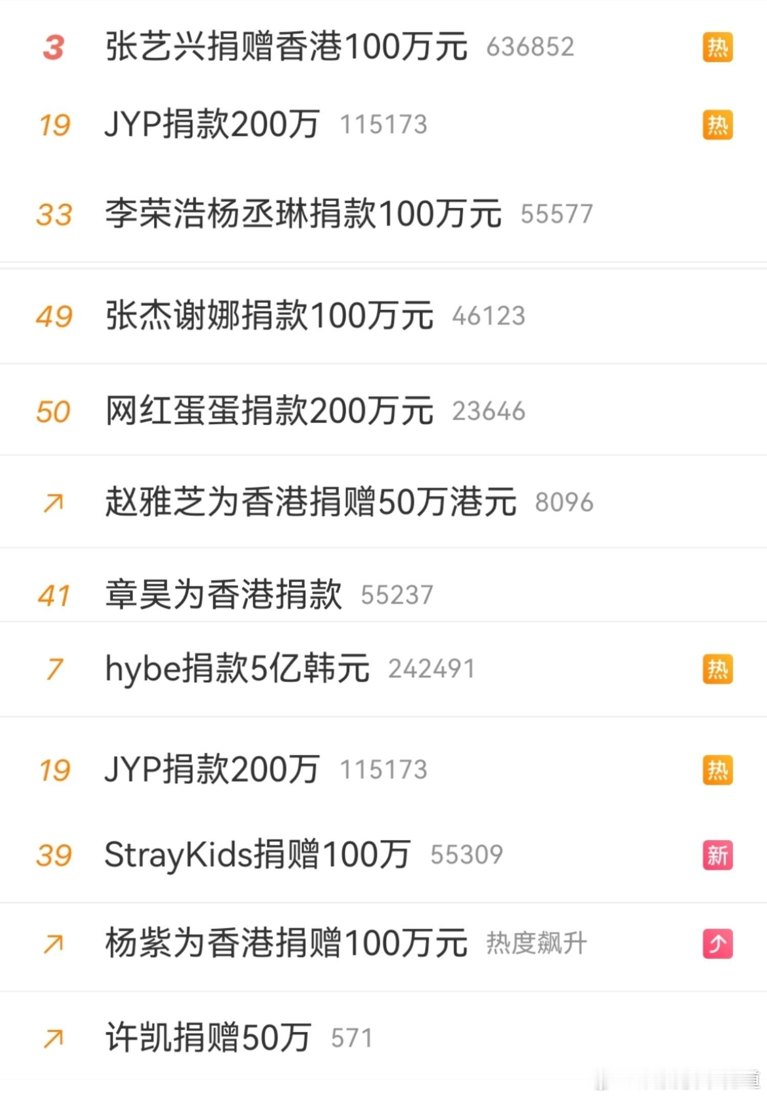 张艺兴捐赠香港100万元张艺兴为香港捐款100万元 杨紫为香港捐赠100万元许凯捐赠50万元许凯捐赠50万 张杰谢娜、李荣浩杨丞琳 赵雅芝等一众明星都在给香港捐赠。网红也在给香港捐款。这次事件不是天灾,是人祸,但是普通民众受到的伤害是切切实实的,为此时伸出援手的明星们点赞。当然大家也不要去细数谁捐了谁没捐,捐是情分,不捐可能也是有什么难处,毕竟家家有本难念的经。杨紫为香港捐赠100万元