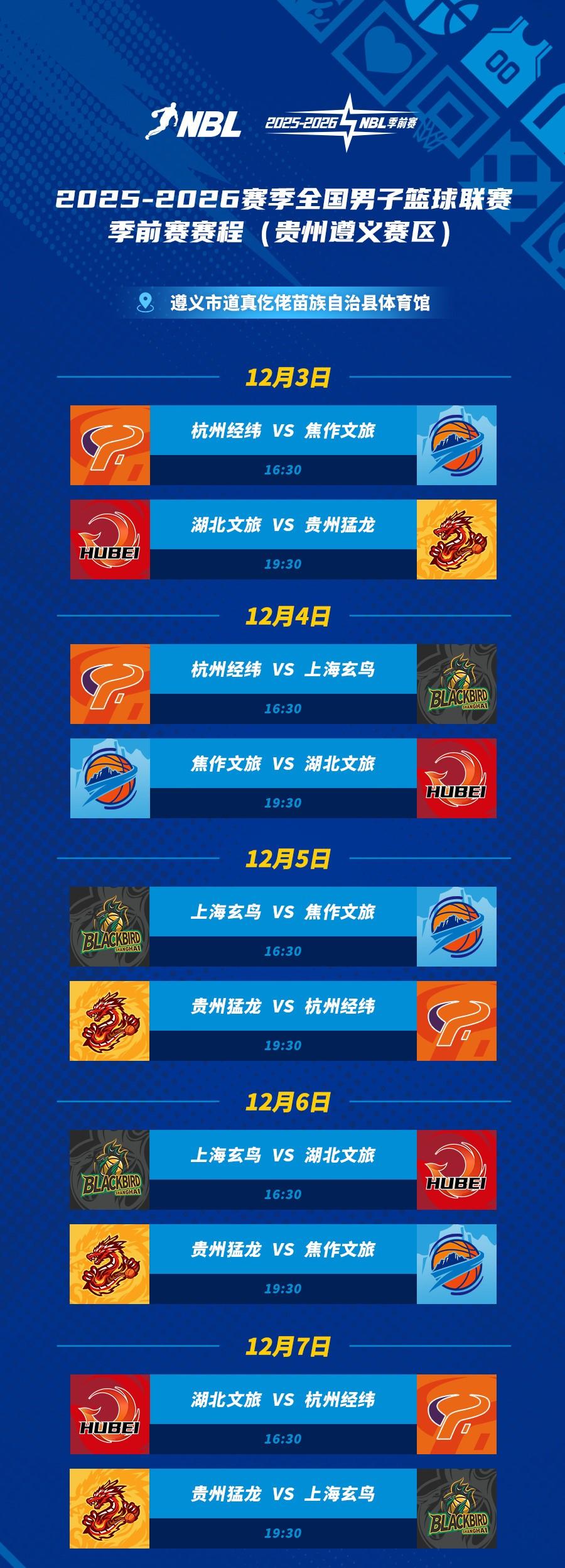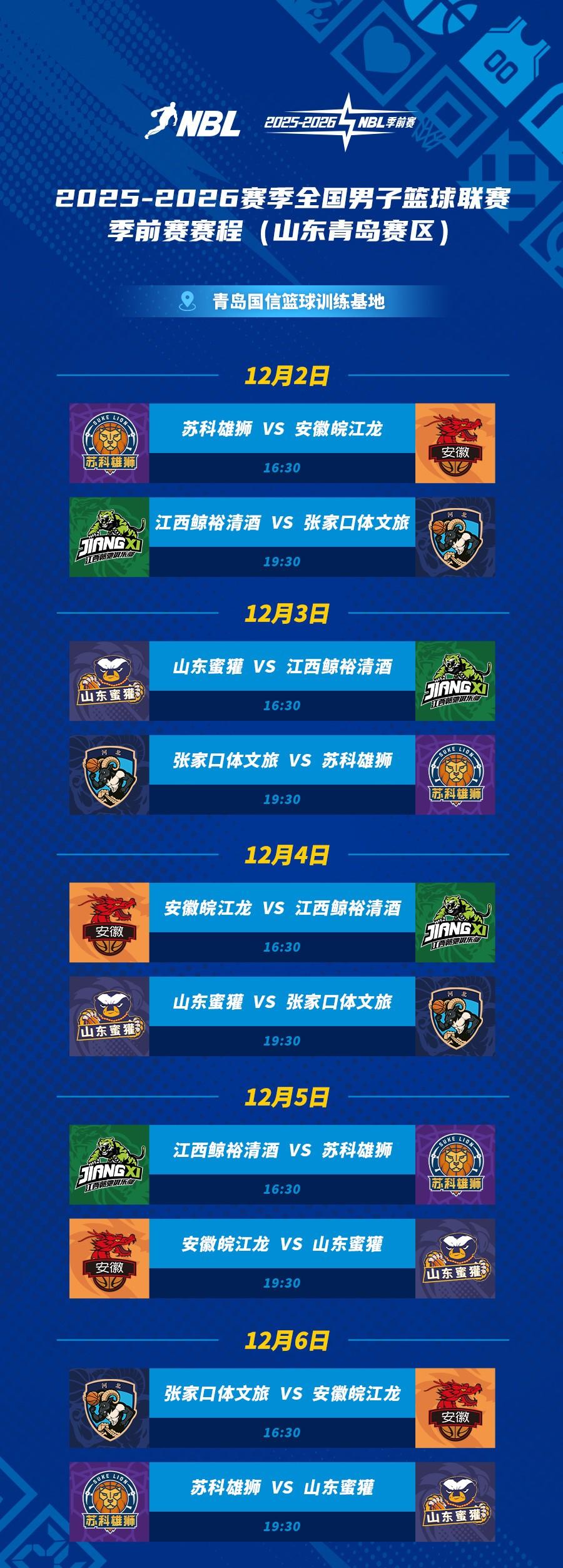 虎扑11月28日讯今日,NBL官方公布季前赛赛程。