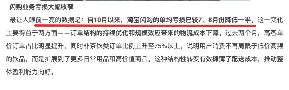 淘宝闪购亏损越来越少,看来外卖大战的硝烟不会轻易散去。 在阿里财报电话会上,蒋凡表示,自从11月以来,淘宝闪购的UE亏损相较7、8月份已经降低一半,主要归功于客单价的提升以及物流成本降低。 另外,尽管外界推测淘宝闪购在外卖大战中烧掉了300多亿,但淘宝闪购的利润还达到了105亿。 通过财报电话会上的一些表达,以及淘宝闪购的营收状况,不难看出两个特点: 第一:淘宝闪购的发展还是在慢慢变好,并且在补贴过程中,是找到了降低成本,提高利润率的办法的。 第二:对于这个亏损是做好了打持久战的心理准备的。所以这个亏损收窄,在这个阿里眼中是符合预期的。 按照这个趋势来看,阿里对于淘宝闪购的投入肯定还会继续,毕竟战略规划的步骤都很清楚,没必要在气势上升的时候放松投入。 换个角度来看。阿里现金和其他流动资金加起来超过5700亿,资金储备非常充足,淘宝闪购虽然暂时亏损,但通过淘宝闪购换来了市场,换来了电商的流量,这怎么看都是赚的。 大公司打仗从来不看一城一池的得失,看的是最后整体的收益,很显然按照当前走过的几个月来看,淘宝闪购打到最后,对于阿里的整体商业版图来说,是有重要战略意义的。所以外卖大战不管别人怎么搞,淘宝闪购坚持投入的战略不会变。