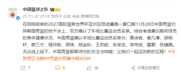 中国男篮对阵韩国大名单 加油,就是干!中国男篮公布了世预赛对阵韩国男篮的大名单:高诗岩、曾凡博、胡明轩、廖三宁、程帅澎、周琦、胡金秋、王岚嵚、朱俊龙、李祥波、雷蒙、张镇麟。