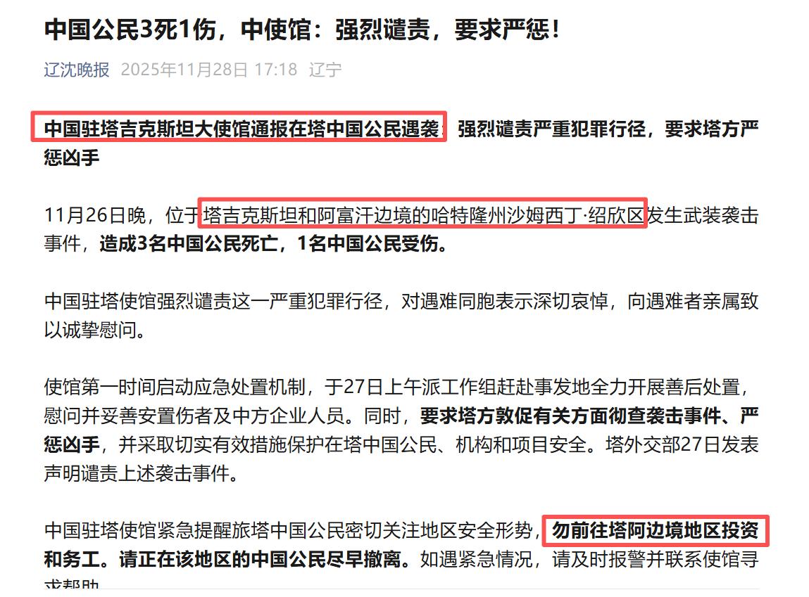 勿前往塔阿边境地区投资和务工。请正在该地区的中国公民尽早撤离!近日发生塔吉克斯坦的哈特隆州沙姆西丁·绍欣区发生武装袭击事件,造成3名中国公民死亡,1名中国公民受伤。 事件发生引发全国人民的关注,作为大国子民在外面务工赚外汇,积极赚钱把钱带回国,补贴家用,突来的牺牲导致了大家的无奈,所以我们一定要多注意外出目的地的安全,不要独立行动,远离危险,一定要及时关注当地的情况,不要进入交战区,更不要露富,要时刻注意一切变化,外国不是国内,国内安全半夜12点都没事,但是外国不一样,外国是要钱还要命的,外加语言障碍无法有效沟通,导致中国公民受伤时有发生! 最后希望塔吉克斯坦重点调查凶手,及时给国人说法,努力的保障国人安全,以后在出现类似情况,我肯定军队直接过去抓凶手,人民军队保护人民,海外的国民也要被保护,要不然都欺负外出务工赚外汇的国人,谁来给撑腰! 这样的事情一定要出台法案,要从根本上解决,避免悲伤事件的再次发生!