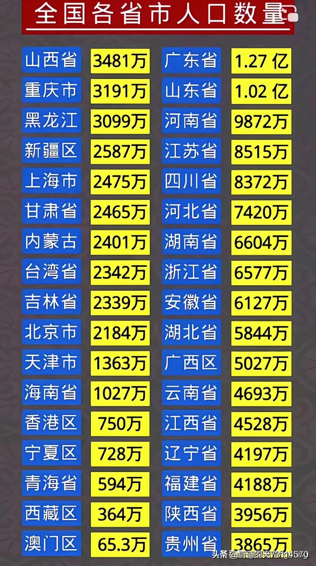第十五届全运会金牌榜和奖牌榜按纯赛会期间(不计加入项)的排名见截图三。 全国各省市区及特别行政区人口(未计入台湾省)数量多少排名榜(见截图二)。 有域迷粉说按人口数量平均金牌,算一个金牌榜排名,即平均每多少万人口夺得一金。现列一个各省市区人口数量排名及各省市区、特别行政区等在第十五届全运会上的人口平均金牌榜,算一下,排个榜(不含独立参赛的行业体协,院校和个人)。 1,香港:83万人/金 2,上海:99万人/金 3,浙江:149.48万人/金 4,福建:161.08万人/金 5,北京:182万人/金。 6,山东:208.12万人/金 7,江苏:224.08万人/金 8,天津:227.17万人/金 9,湖北:243万人/金 10,广东:295.35万人/金 11,西藏:364万人/金 12,辽宁:381.55万人/金 13,吉林:389.83万人/金 14,内蒙古:480.20万人/金 15,广西:502.70万人/金 16,海南:513.50万人/金 17,河南:519.58万人/金 18,四川:523.25万人/金 19,陕西:565.14万人/金 20,河北:570.77万人/金 21,山西:580.17万人/金 22,贵州:644.17万人/金 23,云南:670.43万人/金 24,宁夏:728万人/金 25,新彊:862万人/金 26,安徽:875.29万人/金 27,湖南:943.43万人/金 28,黑龙江:1033万人/金 29,江西:1132万人/金 30,重庆:1595万人/金 另:北京体育大学5金。中国公安体协1金。成都体育学院1金。 不算不知道,一算吓一跳。全运会赛会期间排名第19的天津一跃升至第八名,力压广东、湖北、河南、四川和河北、辽宁、广西等,就是排末的西藏自治区也来到了第11名。 [笑哭][笑哭]这种用人口数量平均算金牌的办法,是一个创举,一算瞬间就把排名算进了列强的行列。[笑哭][笑哭]真是能比不如会算,会算不如均算,不过开心就好!能自娱自乐也不失是一种安慰。