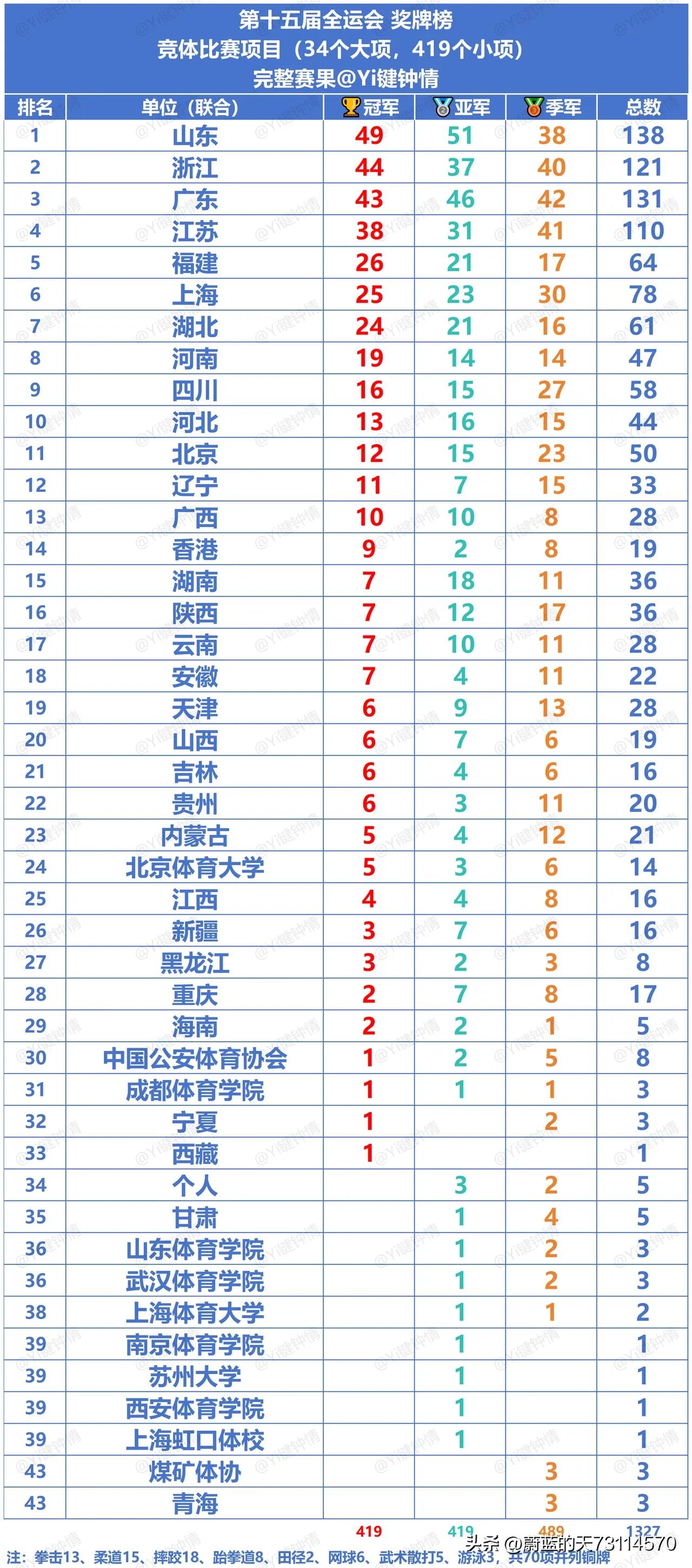第十五届全运会金牌榜和奖牌榜按纯赛会期间(不计加入项)的排名见截图三。 全国各省