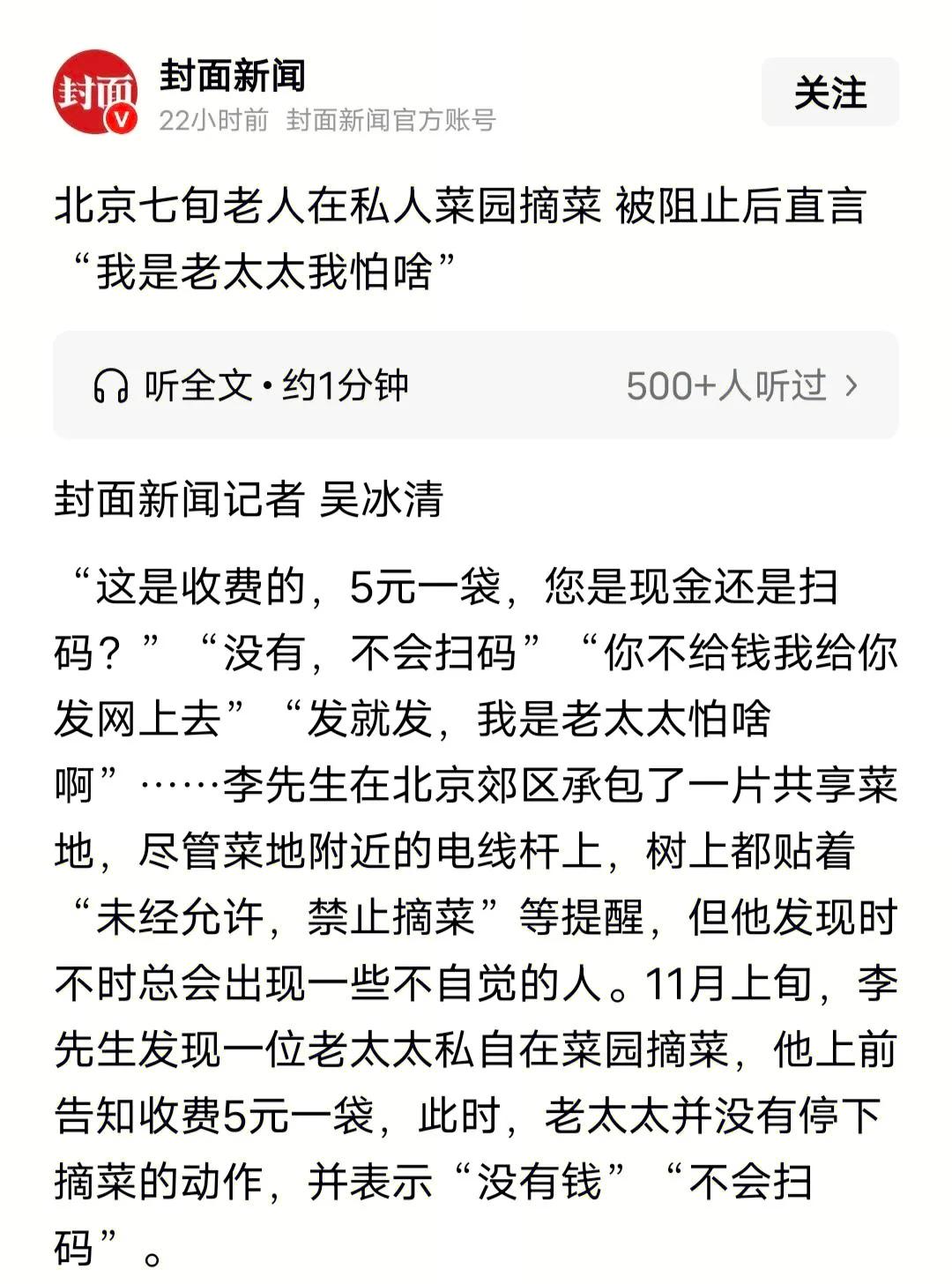 “我70岁了怕啥!”北京老太私闯菜地偷菜还嚣张,法律真的管不了?郊区菜农李先生遭遇糟心事:70多岁老太无视“禁止摘菜”告示,私闯其承包的共享菜地偷菜,被发现后不仅拒不付钱,还扬言“我是老太太怕啥”。尽管李先生有监控和警示标识,却因对方年纪大只能无奈放行。 一、菜地惊魂:七旬老太偷菜被抓,反怼“发网上我也不怕” “这菜是我花钱种的,您不能白摘啊!”在北京郊区的一片共享菜地里,李先生拿着手机录像,气得声音都发颤。眼前的老太太穿着冲锋衣,头戴红帽子,身边的大塑料袋已经装了半袋绿油油的小菜,手里还在不停地拔着菜心。 这是11月上旬的一天,李先生像往常一样去菜地巡查。这片菜地是他承包的,种满了各类蔬菜,本来是供游客付费采摘的,没想到却成了“顺手牵羊”的目标。他早就料到可能有人偷菜,不仅在菜地四周装了围挡,还在电线杆、树干上贴了20多张“未经允许、禁止摘菜”的告示,可还是防不住。 看到老太摘菜,李先生先礼后兵,上前礼貌询问:“您好,您是来采摘的吗?”老太含糊地应了一声“嗯”,手却没停。李先生直接点明收费标准:“5块钱一袋,您知道吧?现金还是扫码?”没想到老太当场耍起无赖:“我没有钱,不会扫码。” 李先生耐着性子解释:“这是我个人花钱种的,不是免费的。”老太却振振有词:“我吃饭回来看到没人就摘了,我都70多岁了,哪来的钱?”说着还拎起菜袋子准备走。李先生气不过,威胁要把视频发网上,老太反而更嚣张了:“发就发,我是老太太怕啥啊!” 最后,看着老太年纪大,偷的菜也值不了几个钱,李先生只能无奈放行。“我真是没招儿,打也不能打,报警估计也只是批评教育,只能认栽。”李先生的话里满是委屈,他承包这片地一年多,这样的偷菜行为已经不是第一次发生了。 二、法律解读:“年纪大”不是免责金牌,偷菜行为早触法! 很多人觉得“不就是几块钱的菜吗?老太太年纪大了,算了吧”,但从法律角度看,老太的行为可不止“占便宜”那么简单,已经涉嫌违法。 1. 民事层面:构成侵权,必须赔偿 李先生承包菜地后,对地里的蔬菜享有合法的所有权。根据《民法典》第1165条规定,行为人因过错侵害他人民事权益造成损害的,应当承担侵权责任。老太明知菜地有围挡和警示标识,仍未经允许私自摘菜,主观上有过错,客观上侵害了李先生的财产权,理应赔偿损失。 赔偿金额也有明确标准,一般按照蔬菜在损失发生时的市场价格计算。比如老太摘的菜市场售价5元,就需要赔偿这5元。别觉得钱少就不用赔,这是对财产权的基本尊重,哪怕只值1块钱,侵权了就得担责。 2. 行政层面:涉嫌盗窃,可处治安处罚 可能有人会说“就5块钱,够不上盗窃吧?”其实,盗窃的认定不仅看金额,还看行为性质。根据《治安管理处罚法》第49条,盗窃公私财物的,可处5日以上10日以下拘留,可以并处500元以下罚款。 老太的行为属于“秘密窃取”,虽然单次金额小,但如果多次实施,或者像她这样屡教不改(无视警示标识),就可能被处以治安拘留。有人觉得“老人年纪大了,不会被拘留”,但法律只是规定“70周岁以上的,不执行行政拘留处罚”,并不是说不用处罚,依然可以处以罚款,并且要求其监护人严加看管。 3. 刑事层面:多次盗窃,可能追刑责 如果老太不仅这次偷菜,还多次在不同地方偷东西,哪怕每次金额都不大,也可能构成“多次盗窃”,触犯《刑法》。根据《刑法》第264条,多次盗窃的,处3年以下有期徒刑、拘役或者管制,并处或者单处罚金。 有人会说“她都70多岁了,刑法也管不了吧?”其实不然,《刑法》第17条之一规定,已满75周岁的人故意犯罪的,可以从轻或者减轻处罚,但这并不是“免责金牌”。如果老太的盗窃行为达到刑事立案标准,依然会被追究刑事责任,只是在量刑时会酌情从轻。 三、网友热议:“倚老卖老”不能惯,维权也要讲方法! 李先生的遭遇被发到网上后,很快引发了网友的热烈讨论,大家的观点五花八门,但核心都围绕着“该不该惯着这种行为”“该怎么维权”这两个问题。 1. 怒怼老太派:“为老不尊就该治!” “年纪大不是特权,不能因为你70岁就可以随便偷东西,这要是年轻人,早就被骂惨了,怎么到了老人这里就该‘算了’?” 2. 理性维权派:“别硬碰硬,报警是关键!” “李先生放她走也是无奈,但其实可以报警的。”有网友提出建议,“哪怕只是批评教育,也能让老太知道这种行为是错的,下次就不敢了。 3. 情理纠结派:“维权难,放任也难!” “我特别理解李先生的无奈,打也打不得,骂也骂不得,报警可能也只是批评教育,最后还是自己吃亏。” 最后,想问大家:如果你是李先生,遇到这样的情况,你会选择放行还是报警?你觉得该如何治理这种“为老不尊”的违法行为?欢迎在评论区留下你的观点!