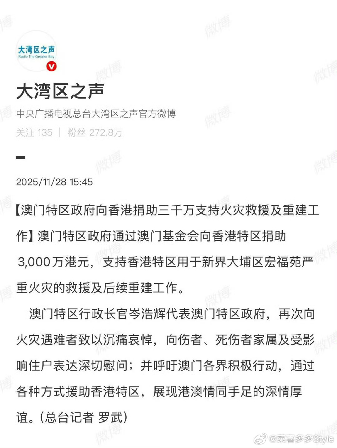 澳门捐款3000万港元驰援香港为澳门点赞捐款有价,情谊无价,澳门驰援香港的3000万港元,体现了“一方有难八方支援”的同胞情深!相信在这份手足之谊的温暖支撑下,在各界爱心的助力下,香港一定能尽快走出灾情阴影,重建美好家园,一起加油吧