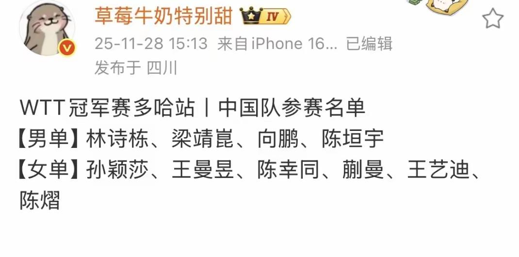 多哈冠军赛这一站 王楚钦休息 孙颖莎继续战斗,不知道是不是我想多了,是不是只要是商业赛,他们两个就必须有一个参赛。 你看月底的混团世界杯完了以后,12月10日的香港总决赛又开始了,孙颖莎就没歇过,看球的都看累了。 虽然真的很想在赛场上,看到孙颖莎出场,但是也希望她好好休息,又不差那个奖杯和奖金,也不差积分排名。大家怎么看呢? 图片源于网络