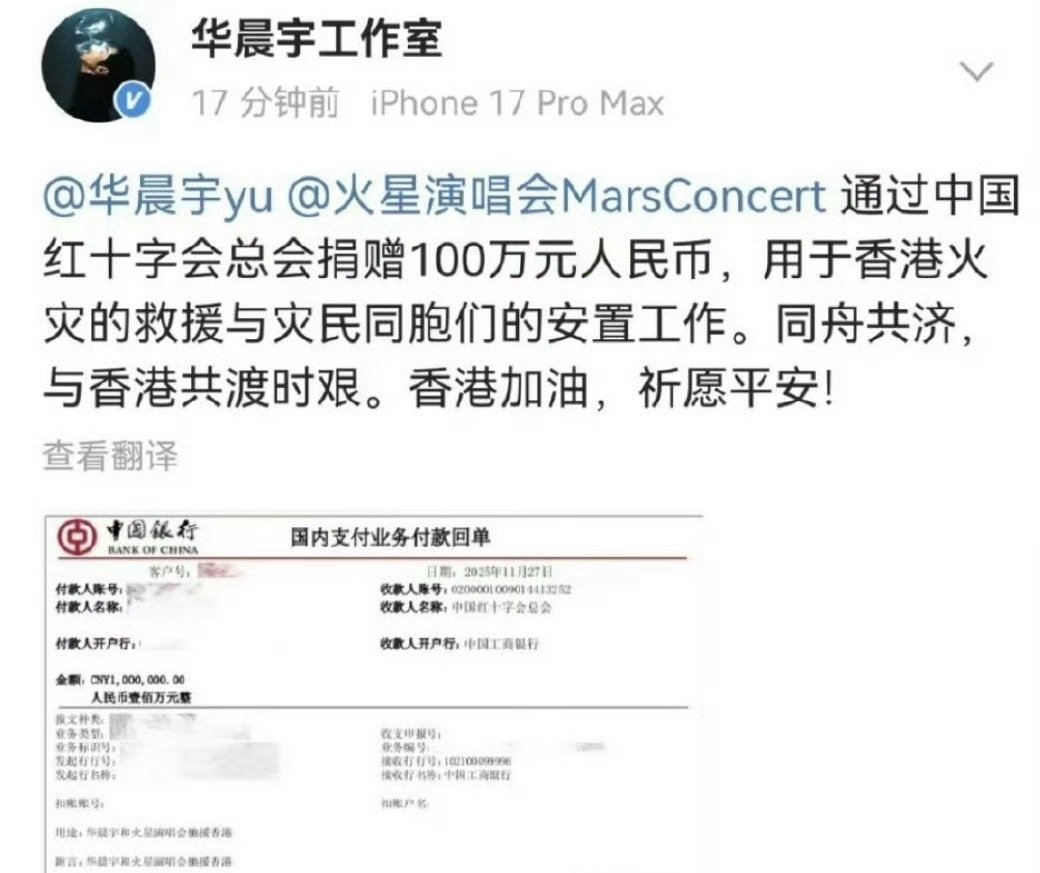 华晨宇捐了100万,昨天就捐了,今天才公布👍🏻