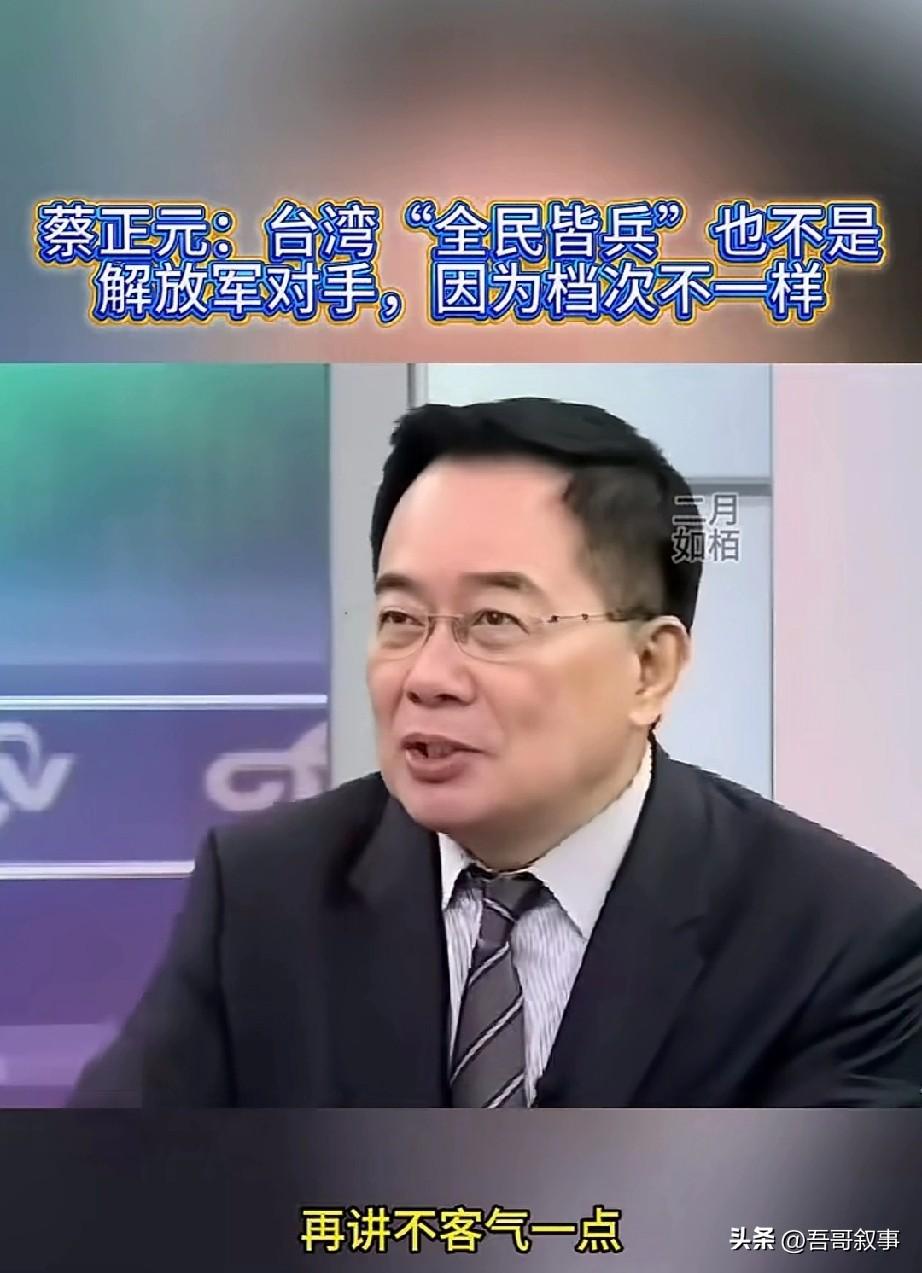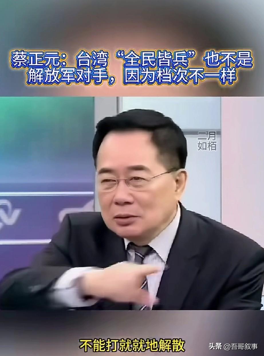 蔡正元提议台军就地解散,避免做无谓牺牲。 蔡正元在一档网络节目中称:“我讲句让台湾泄气的话,即便台湾男女老少不分年龄,全都经过严格训练,也打不过解放军。” 蔡正元解释道,台军以及全民皆兵状态下的台湾民众,与解放军根本不在一个档次。台湾这边就算是轻量级选手再怎么训练,也敌不过重量级的对手。所以此路不通,就得另寻他法。要知道如今大陆解放军以职业军人为主,每人至少有三年的基本训练,而且数量多达250万,连征兵都不需要。单是一个空中突击队,光靠直升机就能运来20万人,而当时台湾军队总共才多少人?所以政治人物思考问题时,得清楚自身的体量和能力。 蔡正元最后表示,作为负责任的政治人物,避战是首要原则。说得再直白些,能打便打,不能打就就地解散,无需做无谓牺牲。 蔡博士等一众台湾名嘴在某些方面的看法和观点较为实事求是、客观,且有自知之明。可惜台湾那些政治人物愚蠢至极,非要以卵击石,最终只会落得鸡飞蛋打、自讨苦吃的下场,还害了军人和老百姓。
