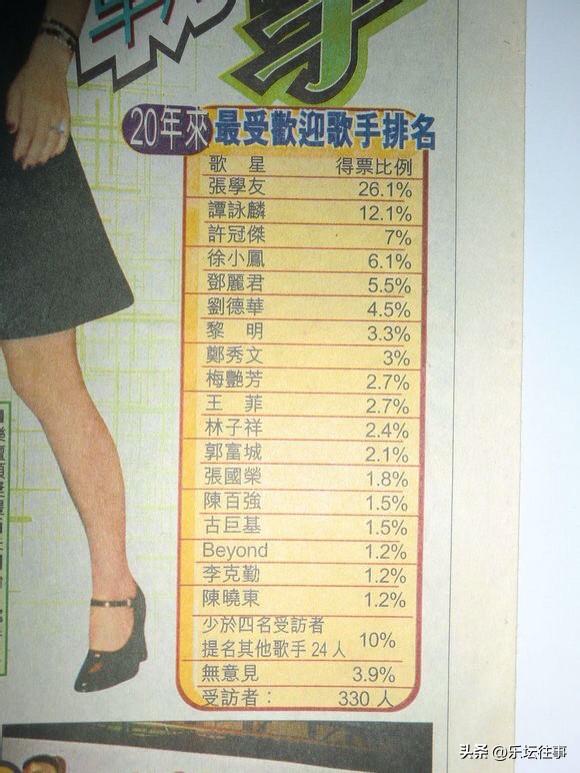香港回归前夕,香港电台根据投票选出的20年最受欢迎歌手 调查访问: "廿载香港最受欢迎歌手" : : 1 Jacky Cheung 张学友 26.1% : : 2 Alan Tam 谭咏麟 12.1% : : 3 Sam Hui 许冠杰 7% : : 4 Paula Tsui 徐小凤 6.1% : : 5 Teresa Tang 邓丽君 5.5% : : 6 Andy Lau 刘德华 4.5% : : 7 Leon Lai 黎 明 3.3% : : 8 Sammi Cheng 郑秀文 3% : : 9 Anita Mui 梅艳芳 2.7% : : 10 Faye Wong 王 菲 2.7% : : 11 George Lam 林子祥 2.4% : : 12 Aaron Kwok 郭富城 2.1% : : 13 Leslie Cheung 张国荣 1.8% : : 14 Danny Chan 陈百强 1.5% : : 15 Leo Ku 古巨基 1.5% : : 16 Beyond Beyond 1.2% : : 17 Hacken Lee 李克勤 1.2% : : 18 Daniel Chan 陈晓东 1.2% 少于四名受访者提名24人略 你最喜欢哪一位?