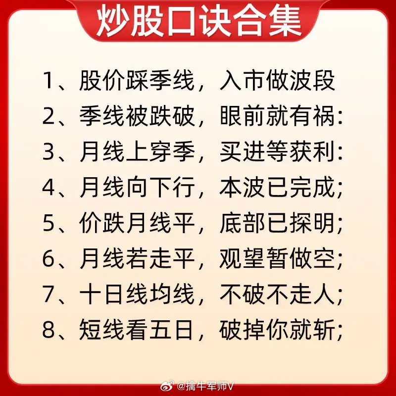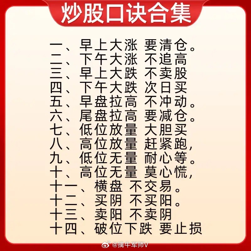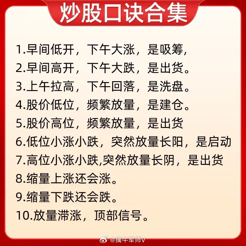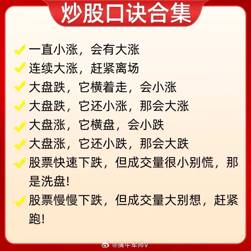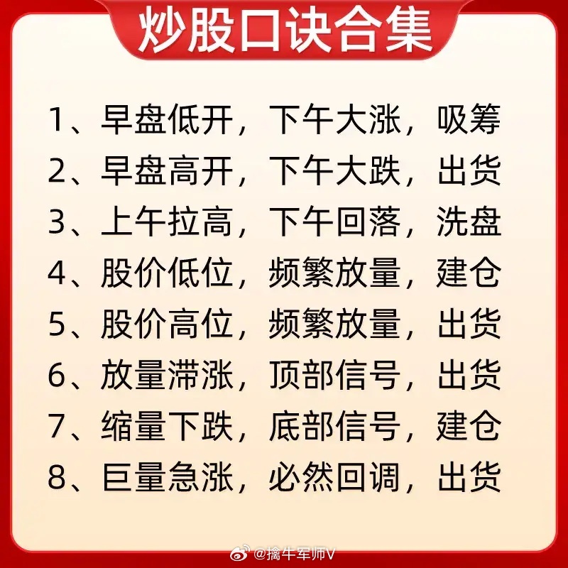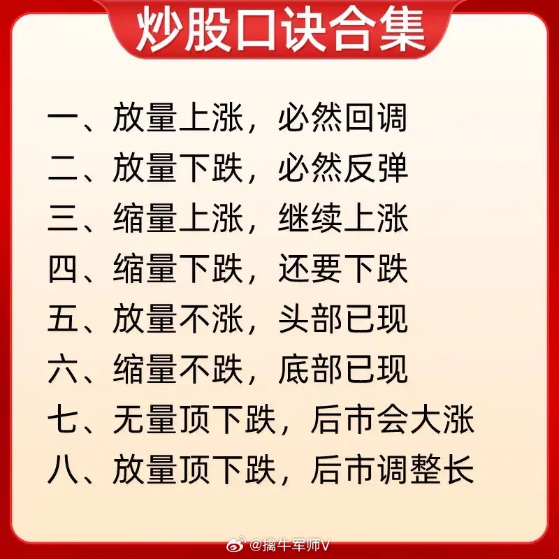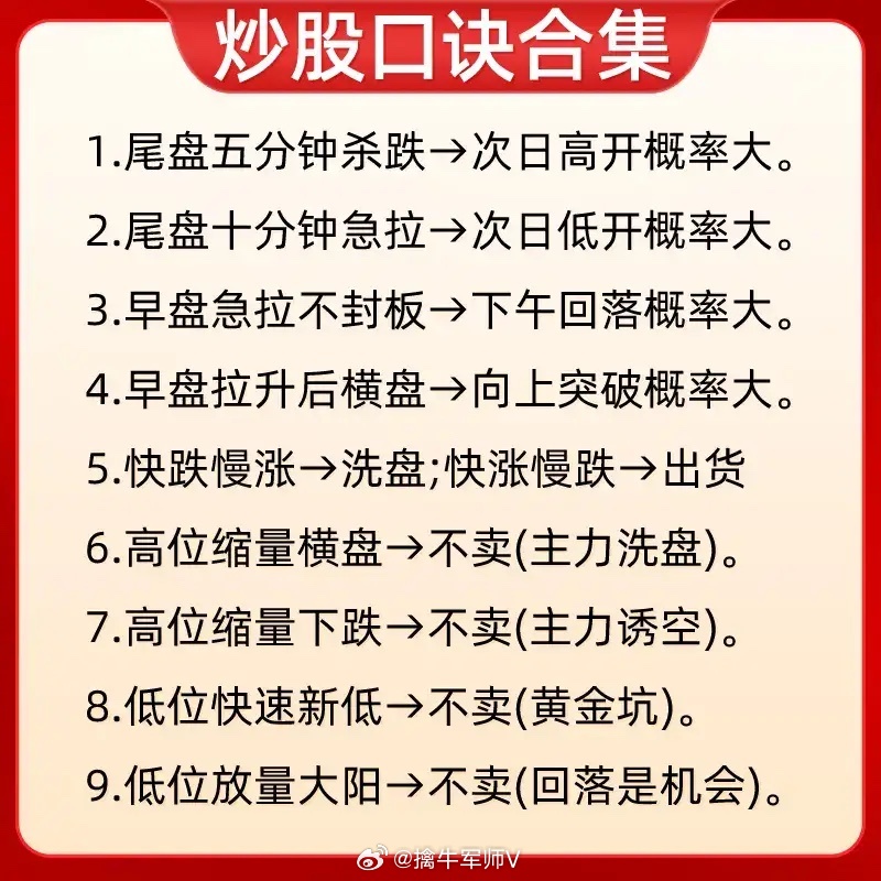 “炒股口诀合集”:第一张聚焦尾盘、早盘走势的概率判断及高低位量价形态操作:如尾盘五分钟杀跌次日高开概率大,早盘急拉不封板下午回落概率大;高位缩量横盘/下跌不卖(主力洗盘/诱空),低位快速新低/放量大阳不卖(黄金坑/回落是机会)等。第二张涵盖自身走势与大盘对比及下跌量能解读:一直小涨会大涨、连续大涨需离场;大盘跌时横盘会小涨、小涨会大涨,大盘涨时横盘会小跌、小跌会大跌;快速下跌量小是洗盘,慢慢下跌量大需跑。第三张围绕成交量与价格走势的关系:放量上涨必回调、放量下跌必反弹;缩量上涨继续涨、缩量下跌还要跌;放量不涨是头部、缩量不跌是底部;无量顶下跌后市大涨,放量顶下跌后市调整长。第四张分析不同走势对应的操作性质:早间低开下午大涨是吸筹,早间高开下午大跌是出货;上午拉高下午回落是洗盘;低位频繁放量/突然放量长阳是建仓/启动,高位频繁放量/突然放量长阴是出货;缩量涨跌延续趋势,放量滞涨是顶部信号。第五张侧重时间与涨跌的操作纪律:早上大涨清仓、下午大涨不追高;早上大跌不卖股、下午大跌次日买;早盘拉高不冲动、尾盘拉高减仓;低位放量大胆买、高位放量赶紧跑;低位无量耐心等、高位无量莫心慌;横盘不交易,买阴不买阳、卖阳不卖阴,破位下跌止损。第六张结合均线(季线、月线、十日线、五日线)判断波段与买卖点:股价踩季线做波段,季线跌破有祸;月线上穿季买进获利,月线下行本波完成;价跌月线平底部探明,月线走平观望做空;十日线不破不走人,短线看五日破掉就斩。第七张重申早盘走势性质与量价策略:早盘低开下午大涨是吸筹,早盘高开下午大跌是出货;上午拉高下午回落是洗盘;低位频繁放量建仓,高位频繁放量出货;放量滞涨是顶部信号需出货,缩量下跌是底部信号可建仓,巨量急涨必回调需出货。整体来看,这些口诀从时间节点、量价配合、大盘联动、均线指标等多维度,为股民提供快速判断走势、识别主力意图及制定操作策略的参考,强调简洁易记的实战性。