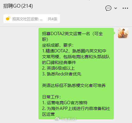 坐标成都,招聘一名英文社区运营,要求精通DOTA2欢迎刀友们转发分享哈!招聘GO
